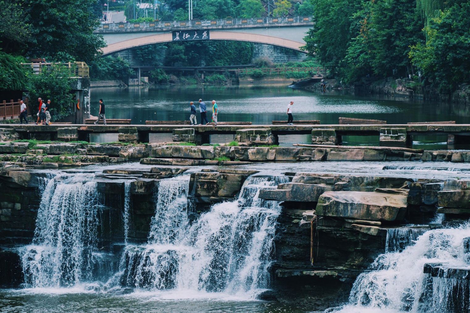在自贡市贡井区的繁华中心,有一座横跨釜溪河的百年平桥。10月23日,桥上人来人往,桥下几十米处,河水却骤然跌入断崖,形成一道宽约80米的瀑布。