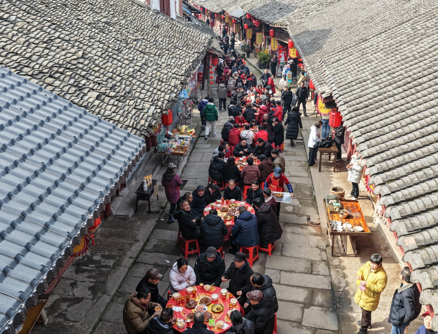 C视频丨四川蓬安:千年古镇举行“团年宴” 返乡游子和乡亲欢聚一堂迎新春