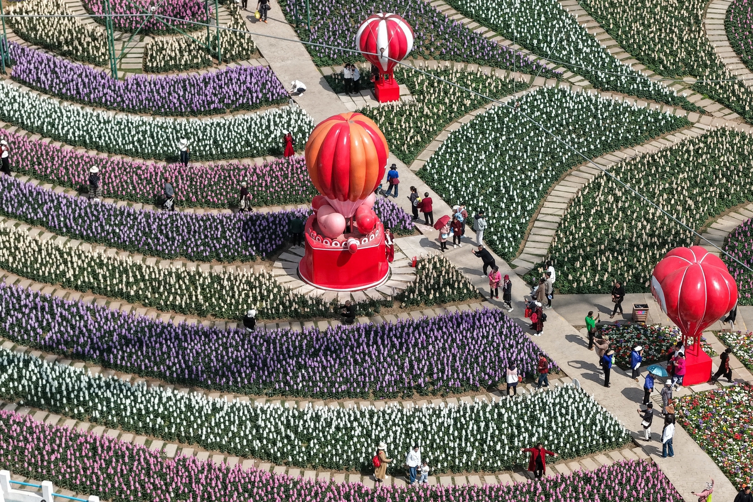 3月4日,成都天气晴好,新都区漫花庄园人流如织,成千上万朵樱花缀满枝头,与连片绽放的虞美人、郁金香等花卉相映成趣,织就一幅五彩斑斓的春日画卷。