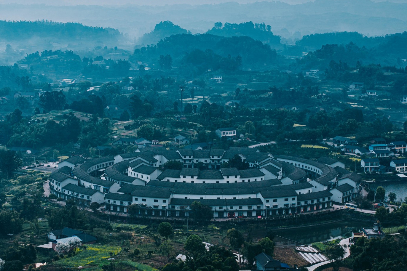 3月22日,自贡市荣县留佳镇的凤龙新村独具客家围楼风格的新村建筑,以圆形为中心层层向外舒展,环环相连,整体造型酷似电影《大鱼海棠》中的经典场景。