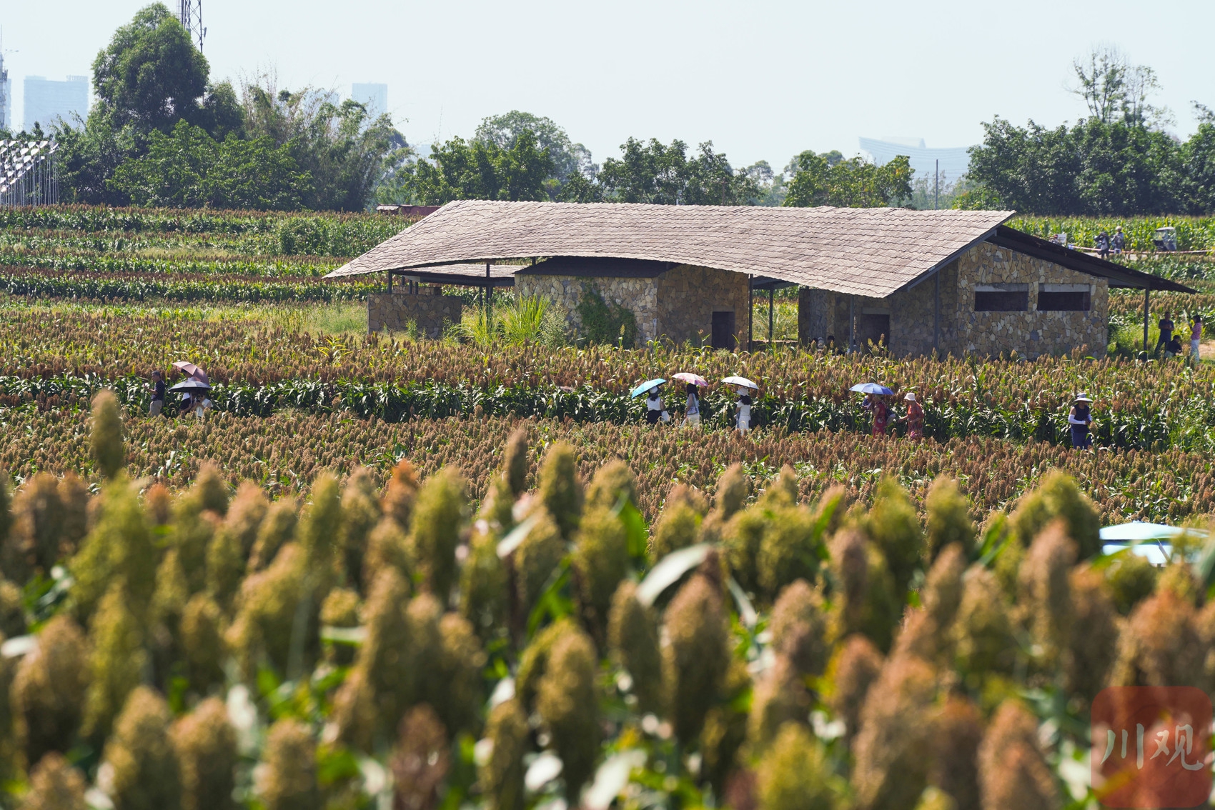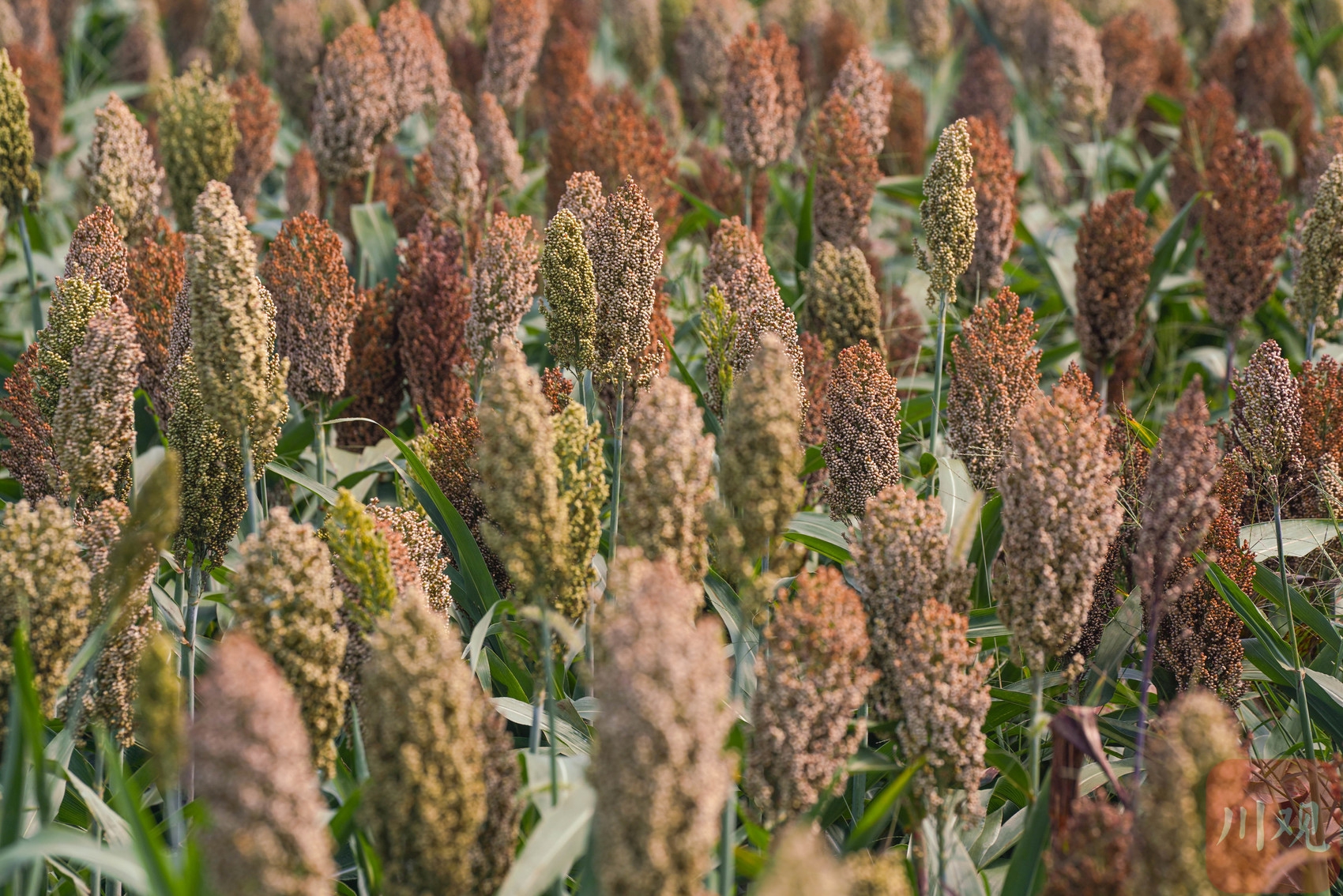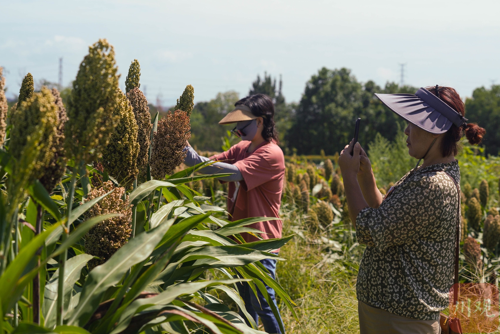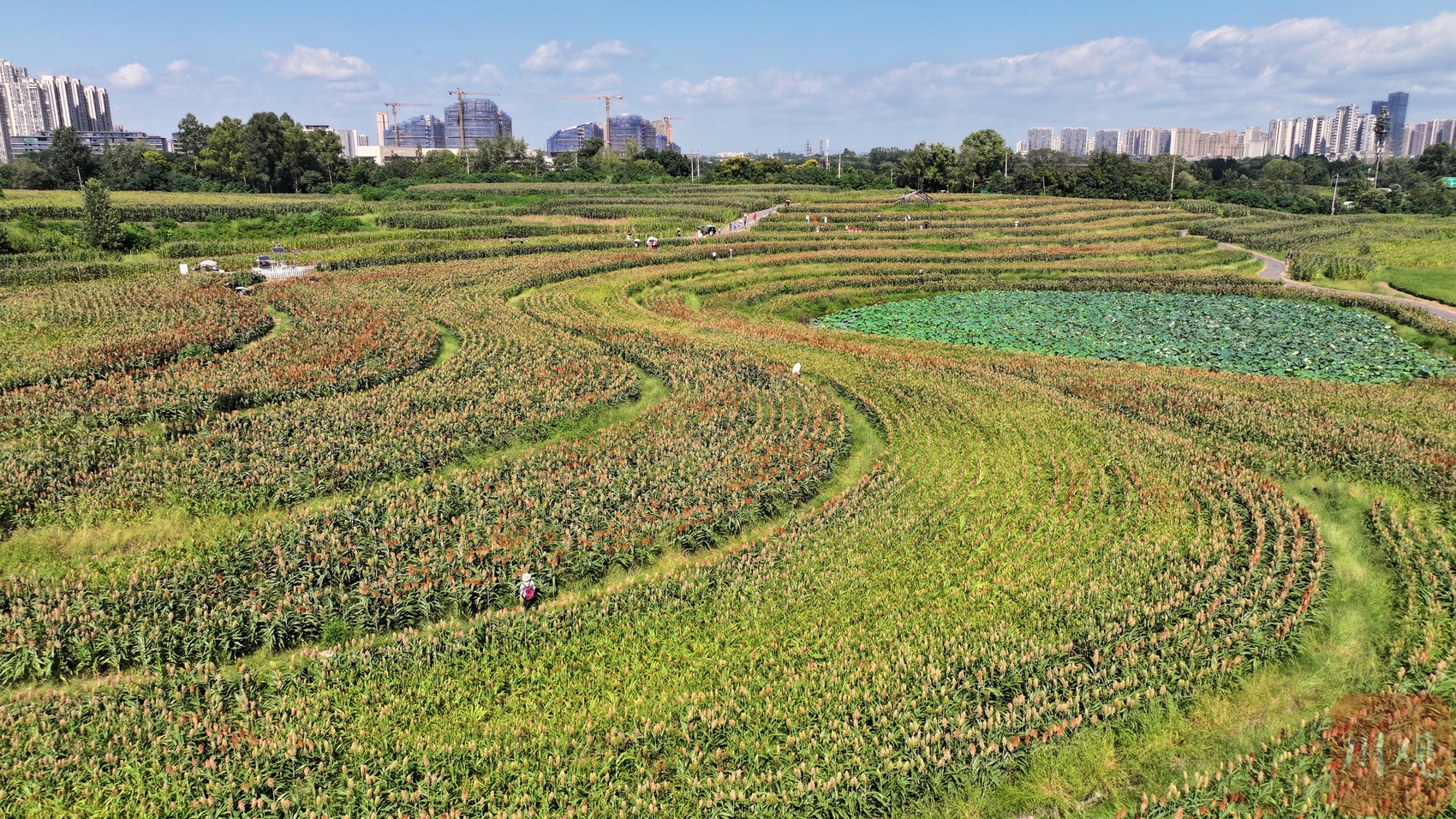 9月8日,四川在线记者实地探访这片高粱田。得益于今年光温水条件适宜,高粱成熟期较往年提前,整片田野已呈现出红、橙、黄、绿交织的渐变色调,宛如大自然亲手绘制的调色盘。微风拂过,穗浪轻晃,这般灵动景致堪比现实版“莫奈花园”,为钢筋水泥的城市增添了几分秋日诗意。
