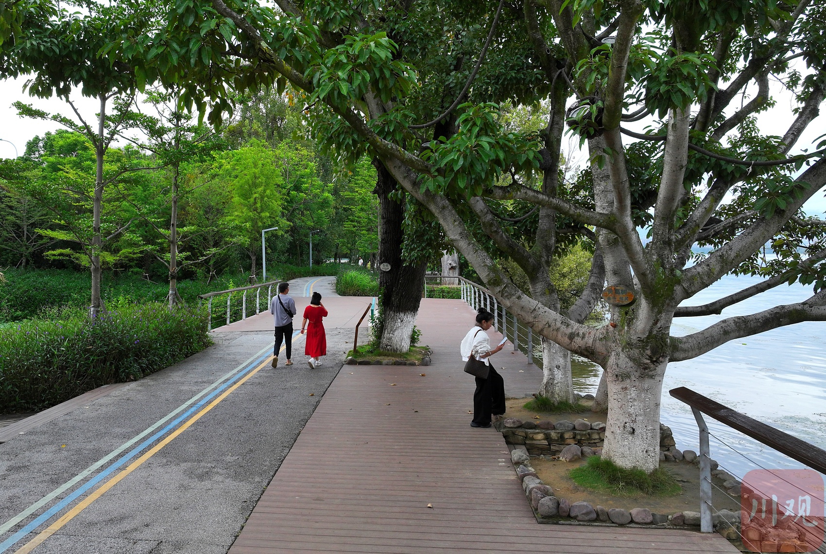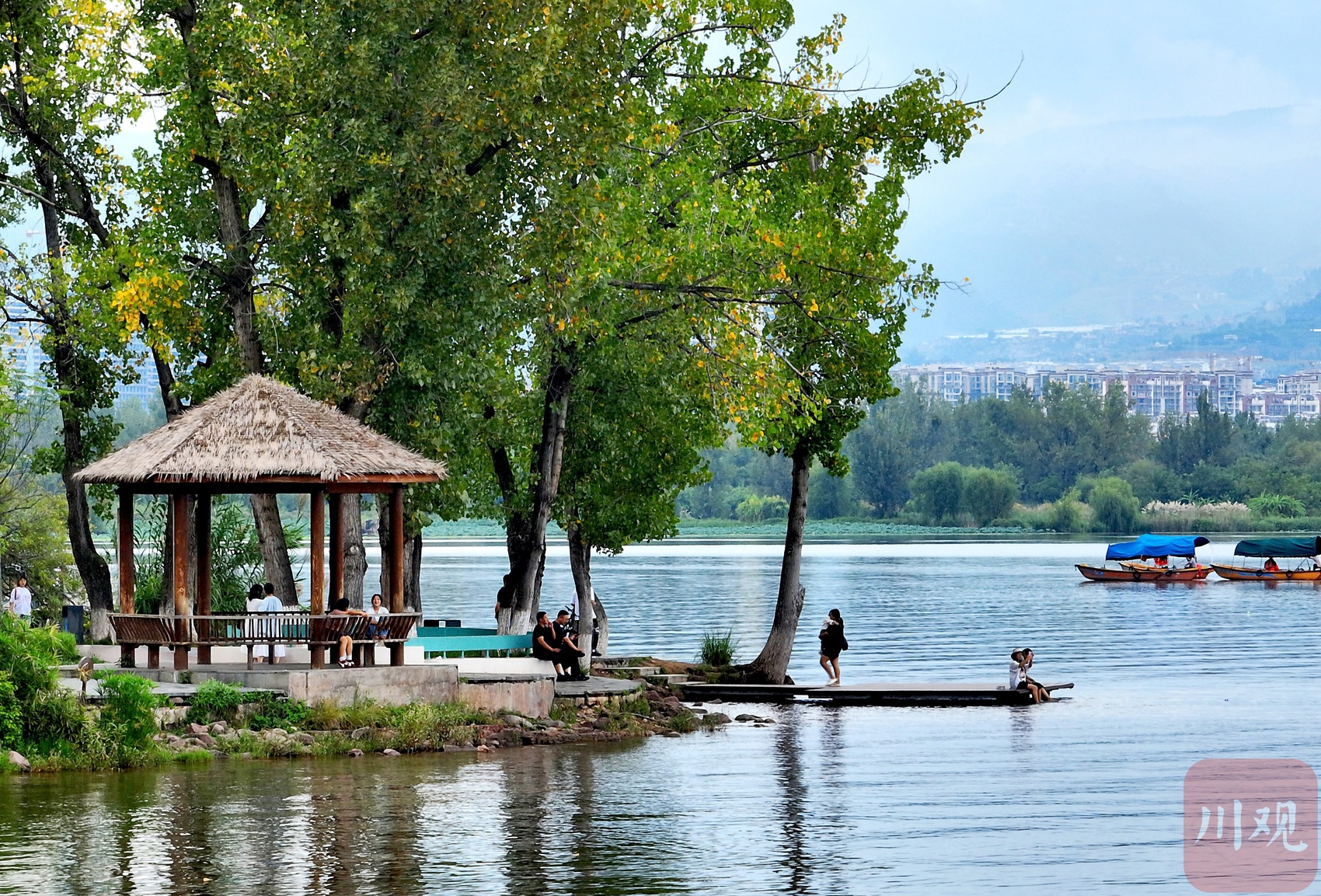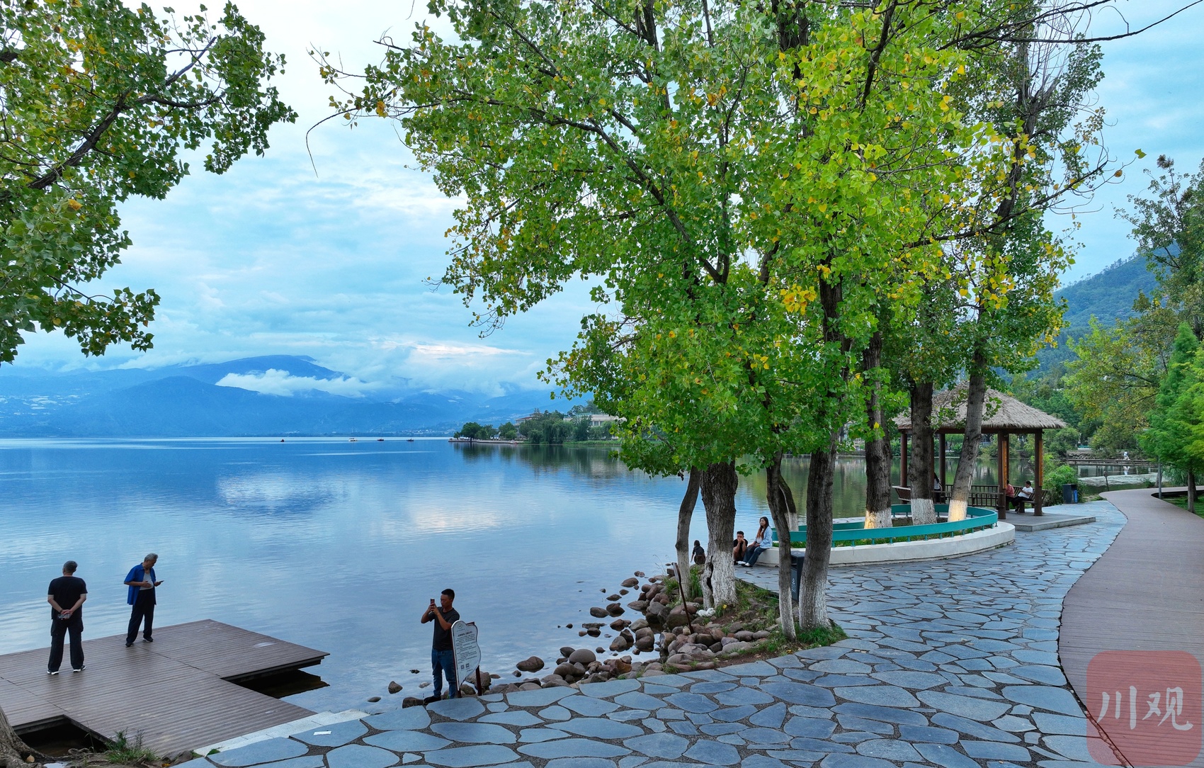 9月8日,秋雨初霁,四川西昌邛海国家湿地公园宛如一幅被秋雨浸润的水墨长卷。湖水与远天交融,湖畔绿道蜿蜒舒展,与雨后愈发葱郁的草木相映成趣。游人或漫步绿道,或驻足观景、拍照,悠然沉浸在这片静谧清新的景致中。