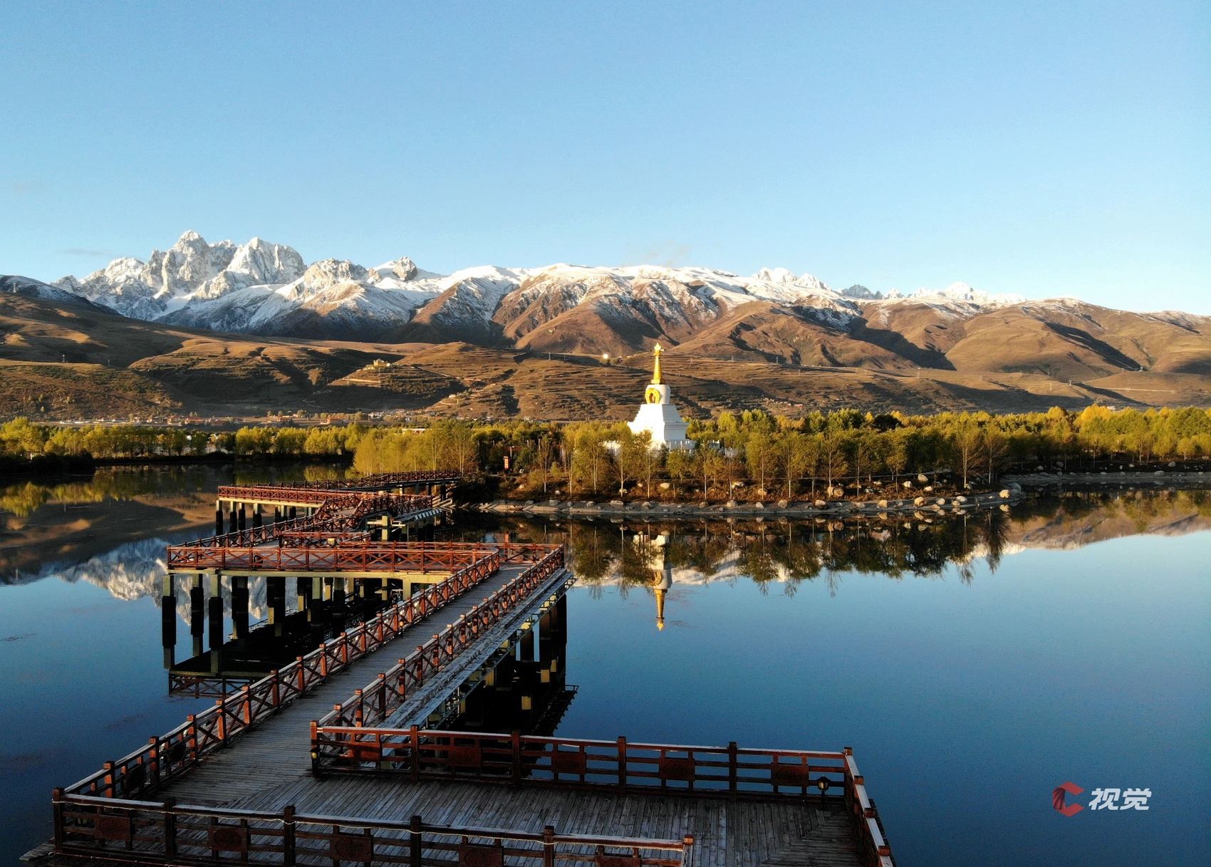秋季覆雪的珠牡拉措澄净秀美,卓达拉雪山、彩林、曲桥好似人间仙境。C视觉签约摄影师 曹省利