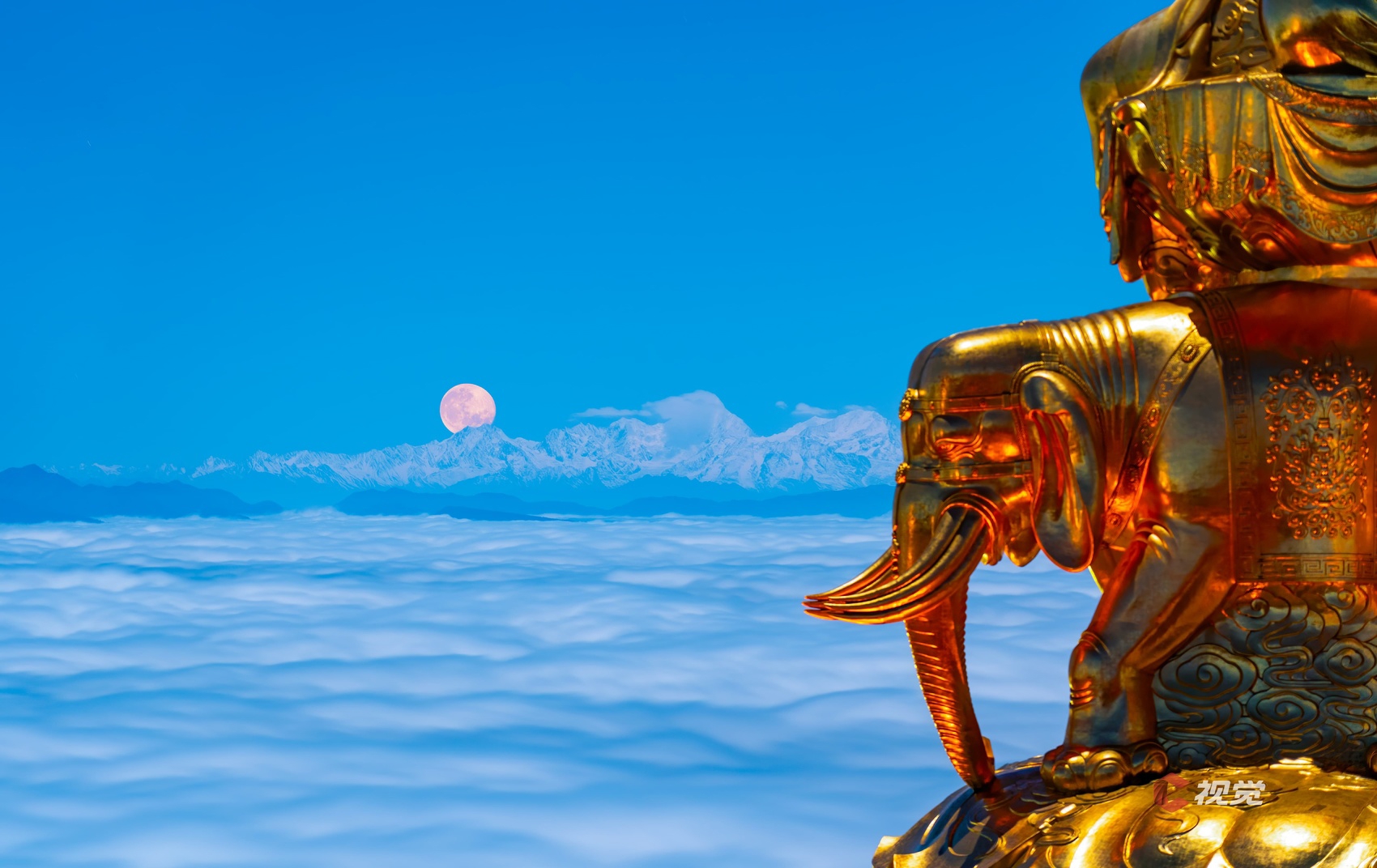 遥望峨眉山与云海之上的贡嘎同框,月亮遥挂天边,浪漫唯美。C视觉签约摄影师 郭星星