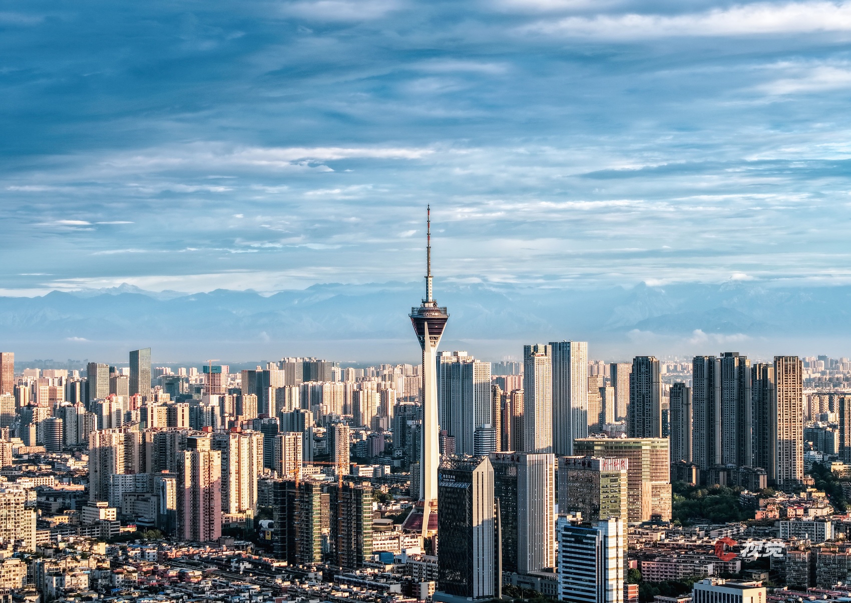 10月13日清晨,成都市区天空通透,天府熊猫塔在雪山的映衬下更显灵秀。C视觉签约摄影师 廖芳