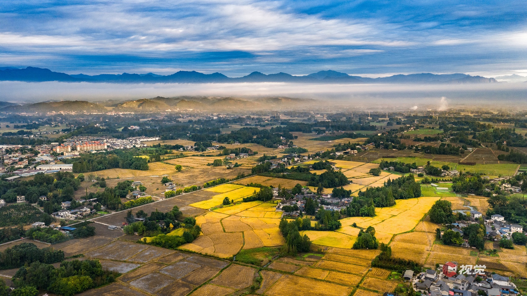 10月13日晨曦时分,在成都崇州,雪山群峰与金色稻田同框。C视觉签约摄影师 李旭