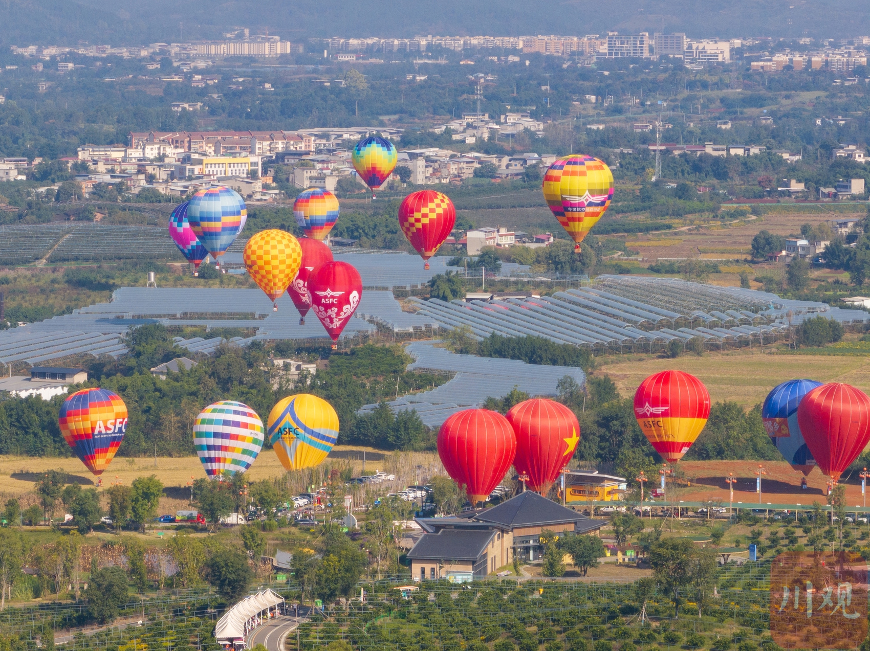 图为10月15日,热气球在金堂县三溪镇天府橘乡景区陆续升空。