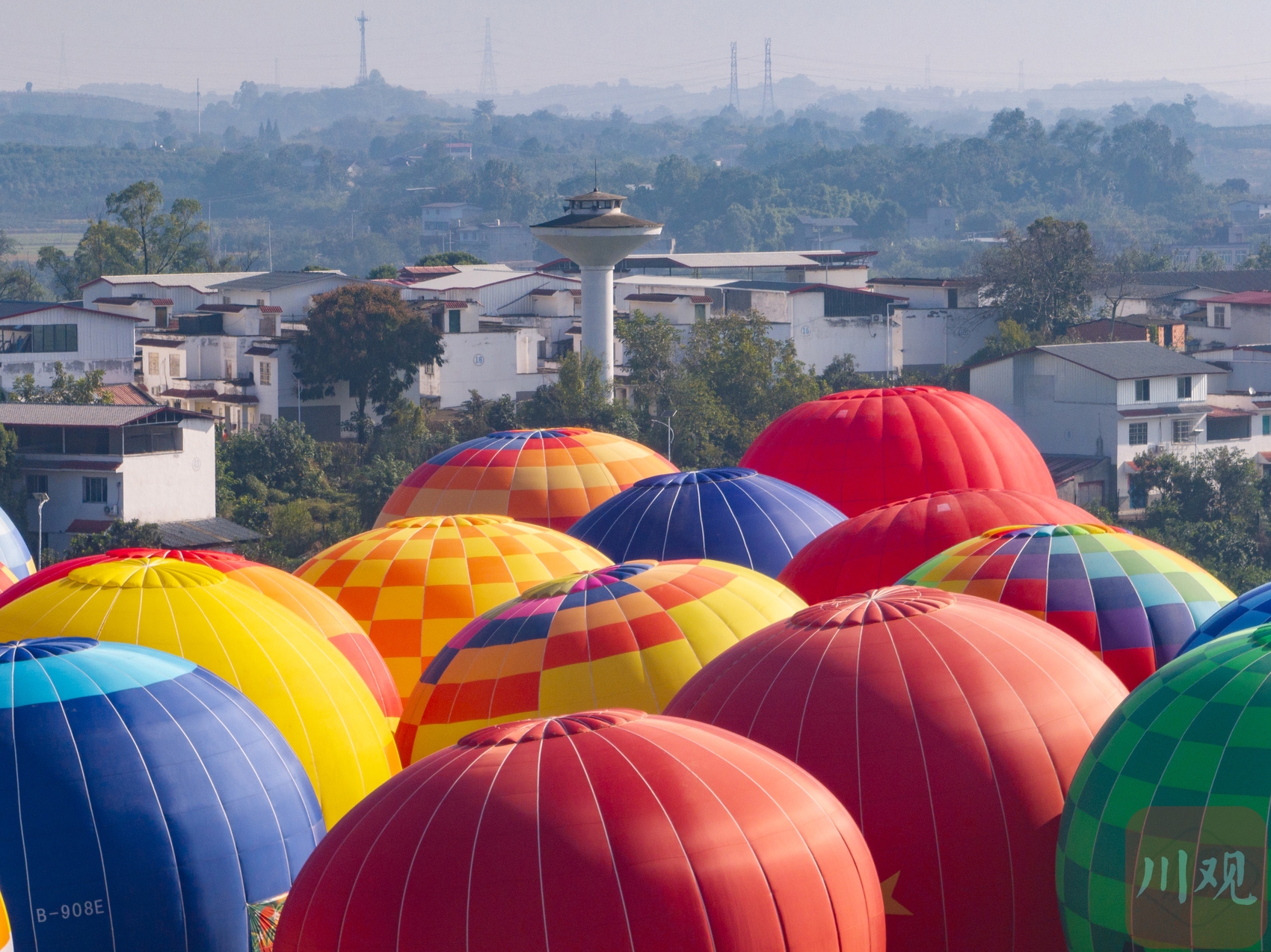 图为10月15日,30支热气球在金堂县三溪镇天府橘乡景区整装待发。