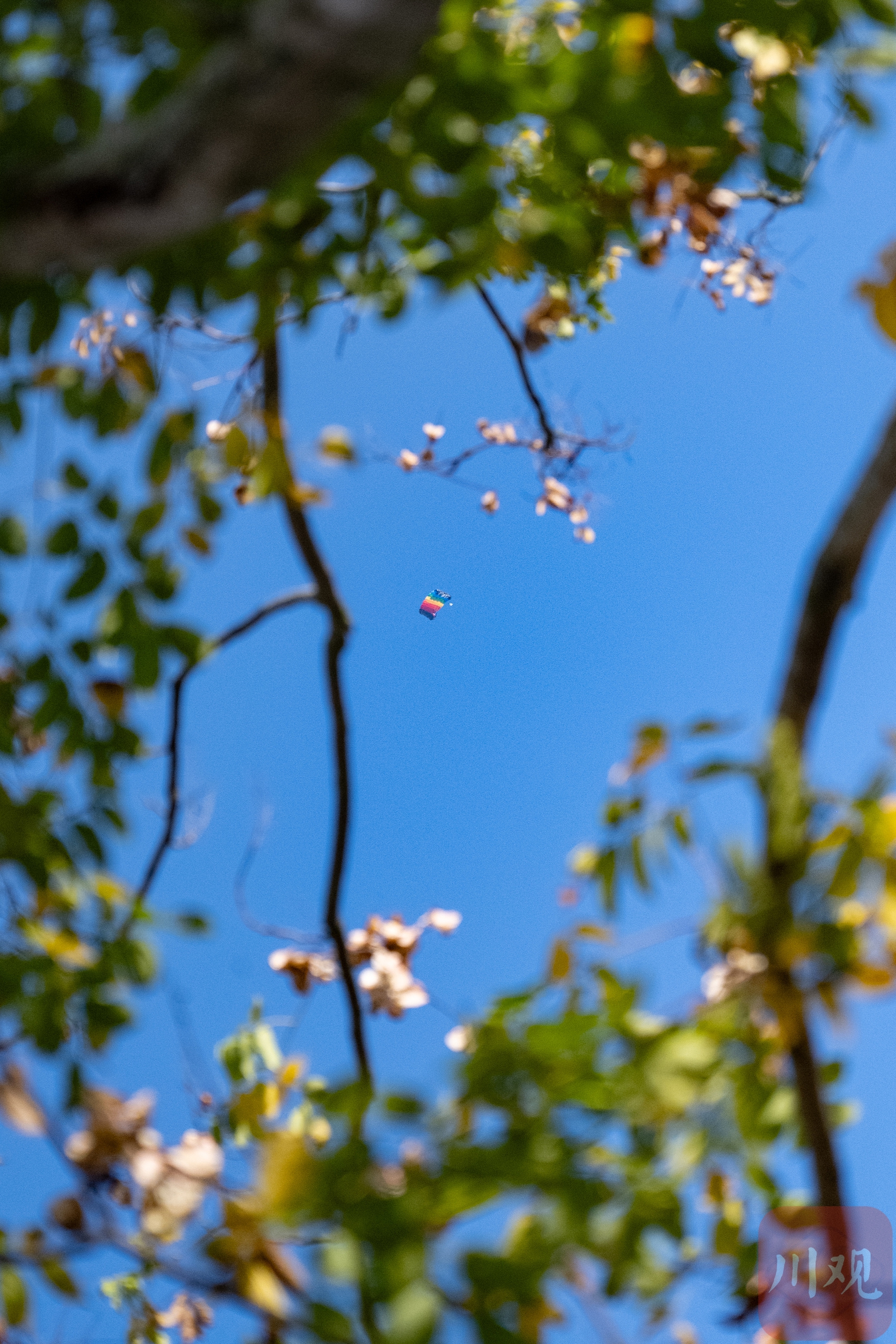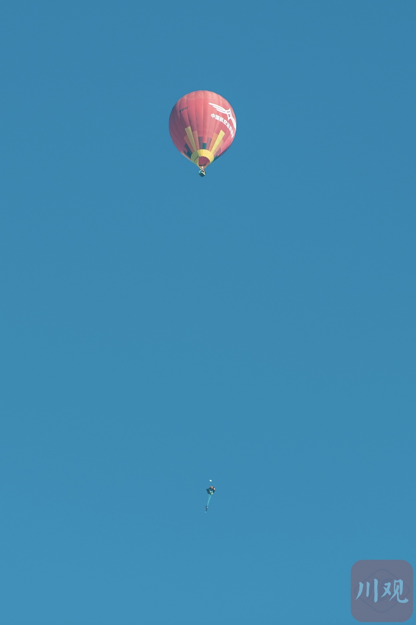 图为10月15日,跳伞运动员在开幕式上空进行热气球800米定点跳伞表演。