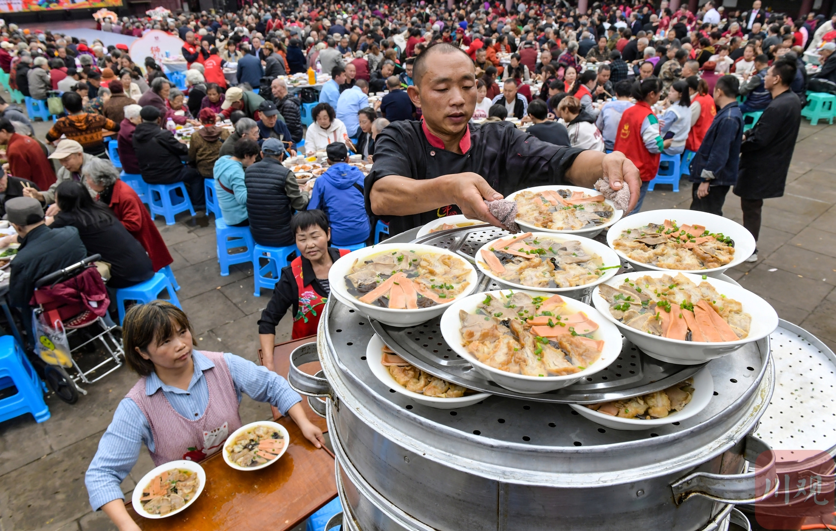 在成都市双流区黄龙溪镇黄龙社区黄龙大剧院,老人品尝“坝坝宴”喜迎九九重阳节。