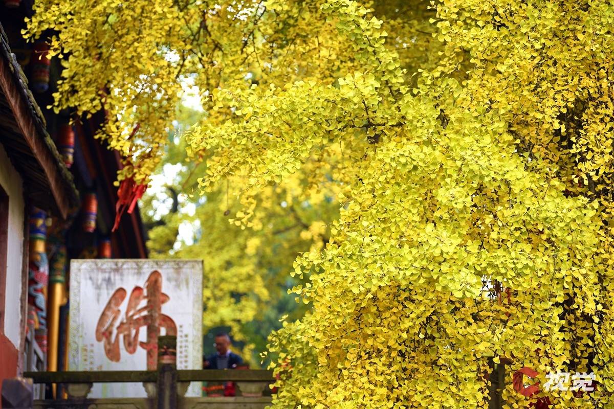 11月2日,金堂县云顶山慈云寺内,成都地区最早“呈”黄的千年银杏“夫妻树”进入观赏期,吸引不少市民游客前来观光打卡。