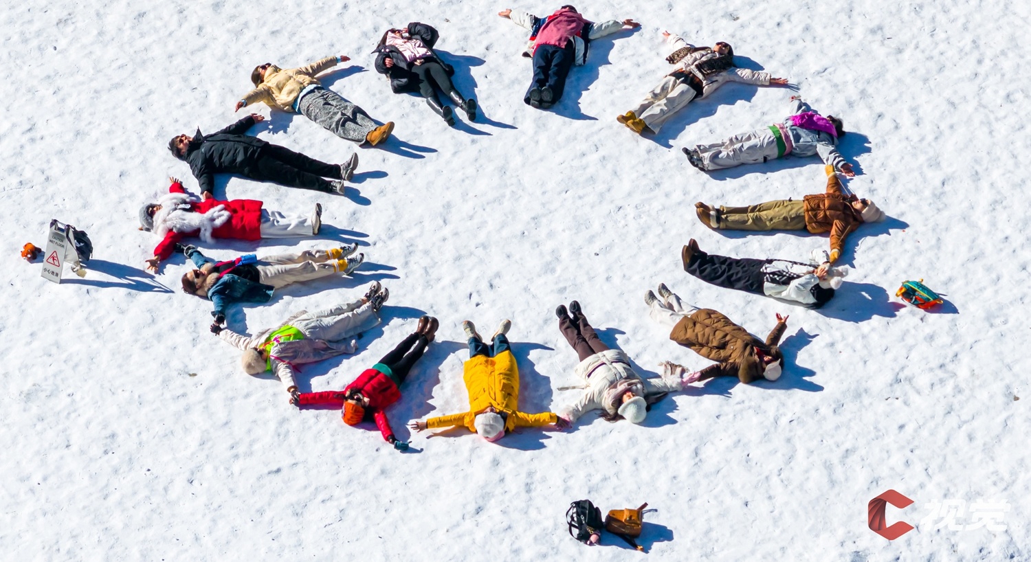 阿坝州理县毕棚沟,游客在雪地上躺成一圈,拍摄趣味自拍。 C视觉签约摄影师 张承安 摄