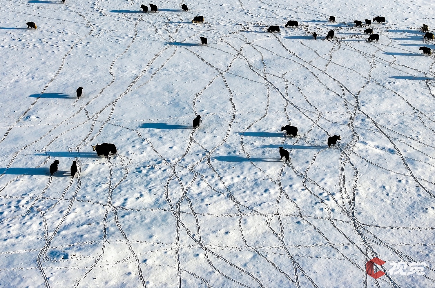 阿坝州红原县境内,牦牛群行进在白雪覆盖的草原上。 C视觉签约摄影师 谢宏程 摄