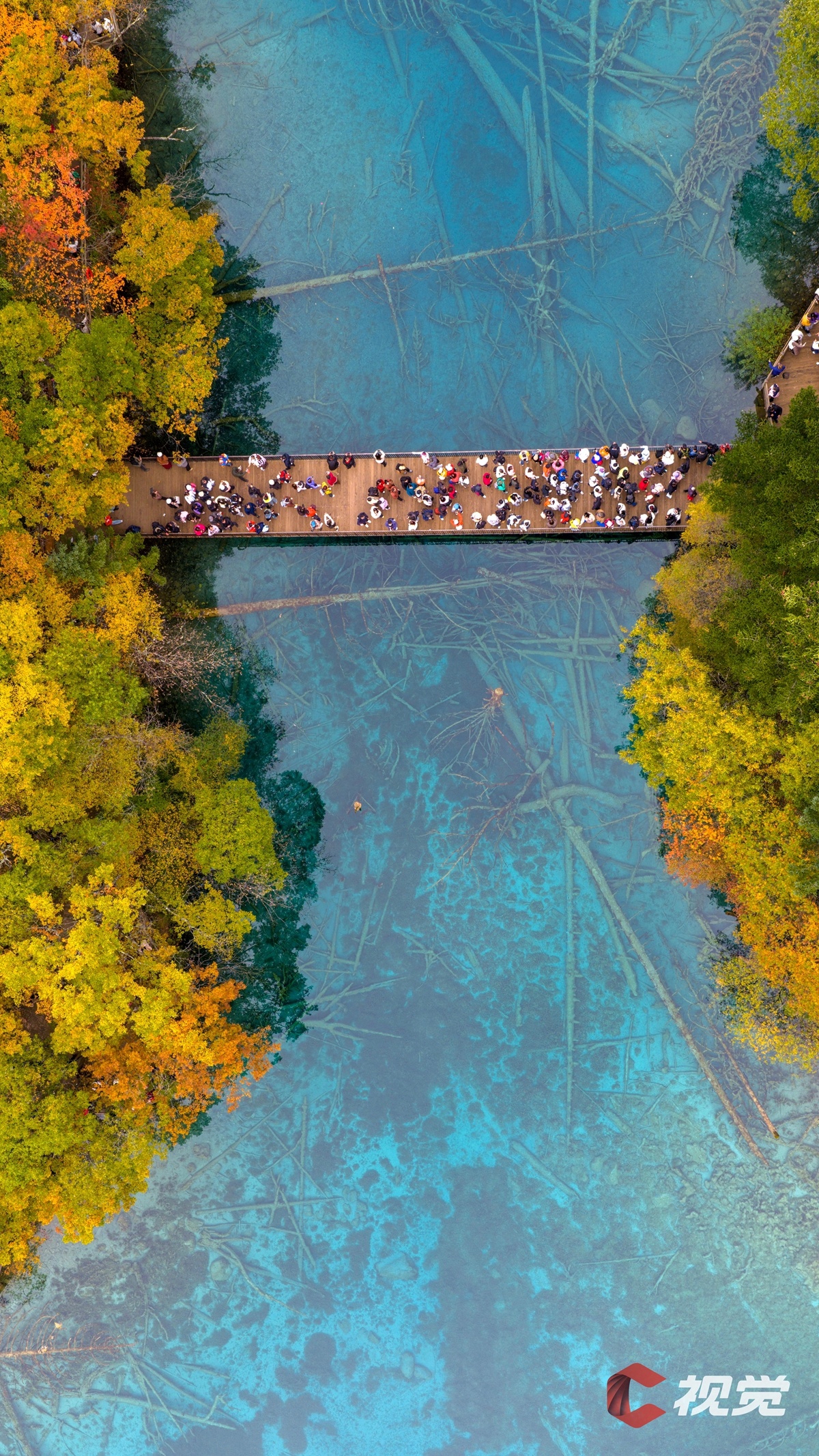 10月31日,阿坝州九寨沟景区彩林迎来最佳观赏期,众多游客在五花海赏景拍照。