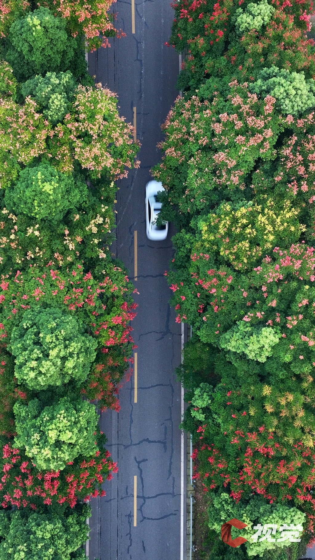 9月20日,成都崇州市道明镇重庆路竹艺村段,道路两旁的栾花绚烂如霞。
