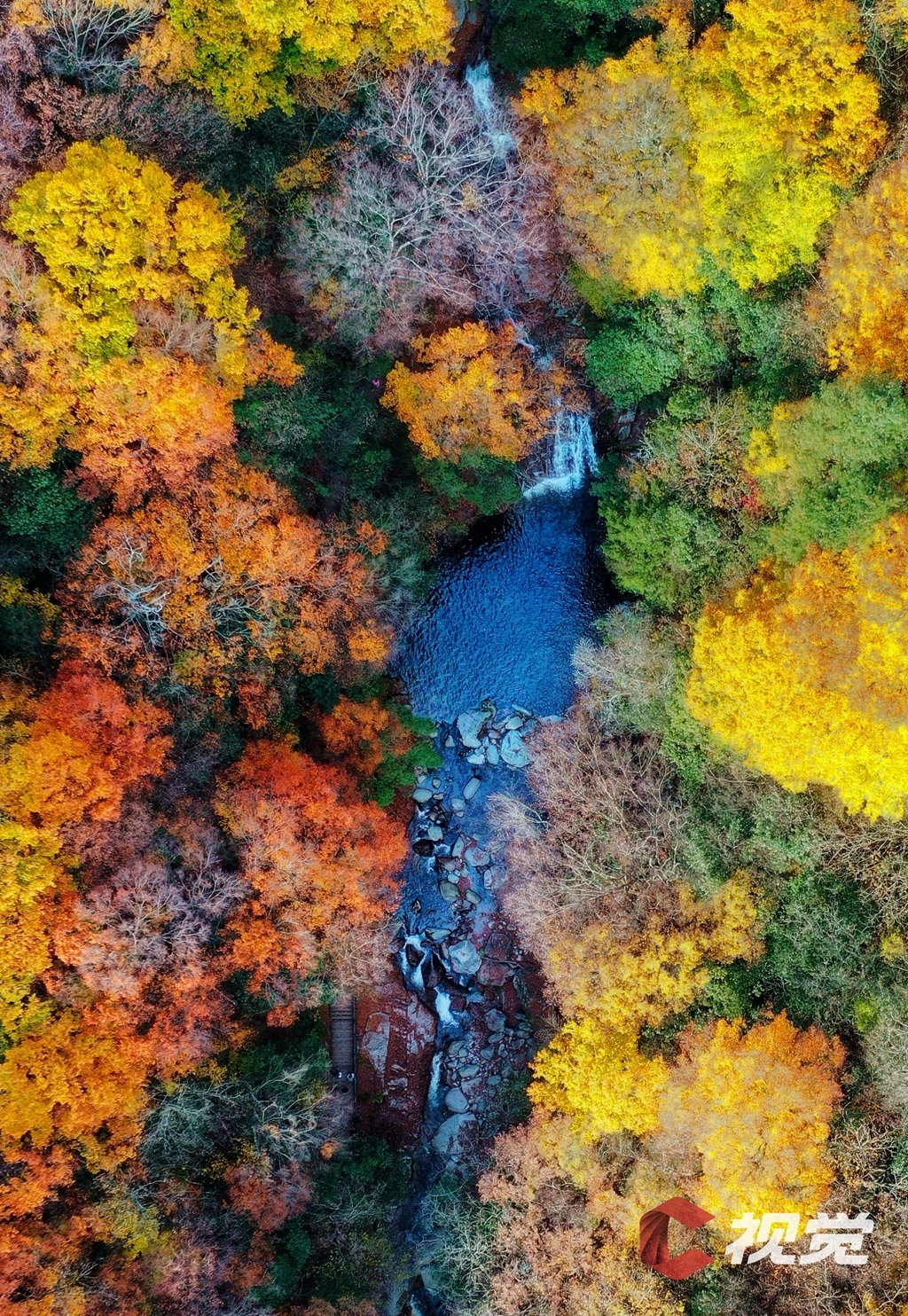 11月1日,巴中市南江县光雾山十八月潭景区,红叶簇拥着水潭,好似一幅色彩斑斓的油画。