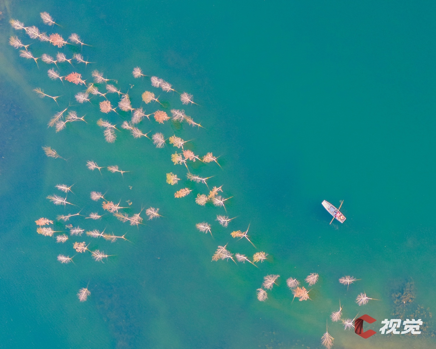 11月9日,小船驶过广安华蓥市天池湖的水上彩林。