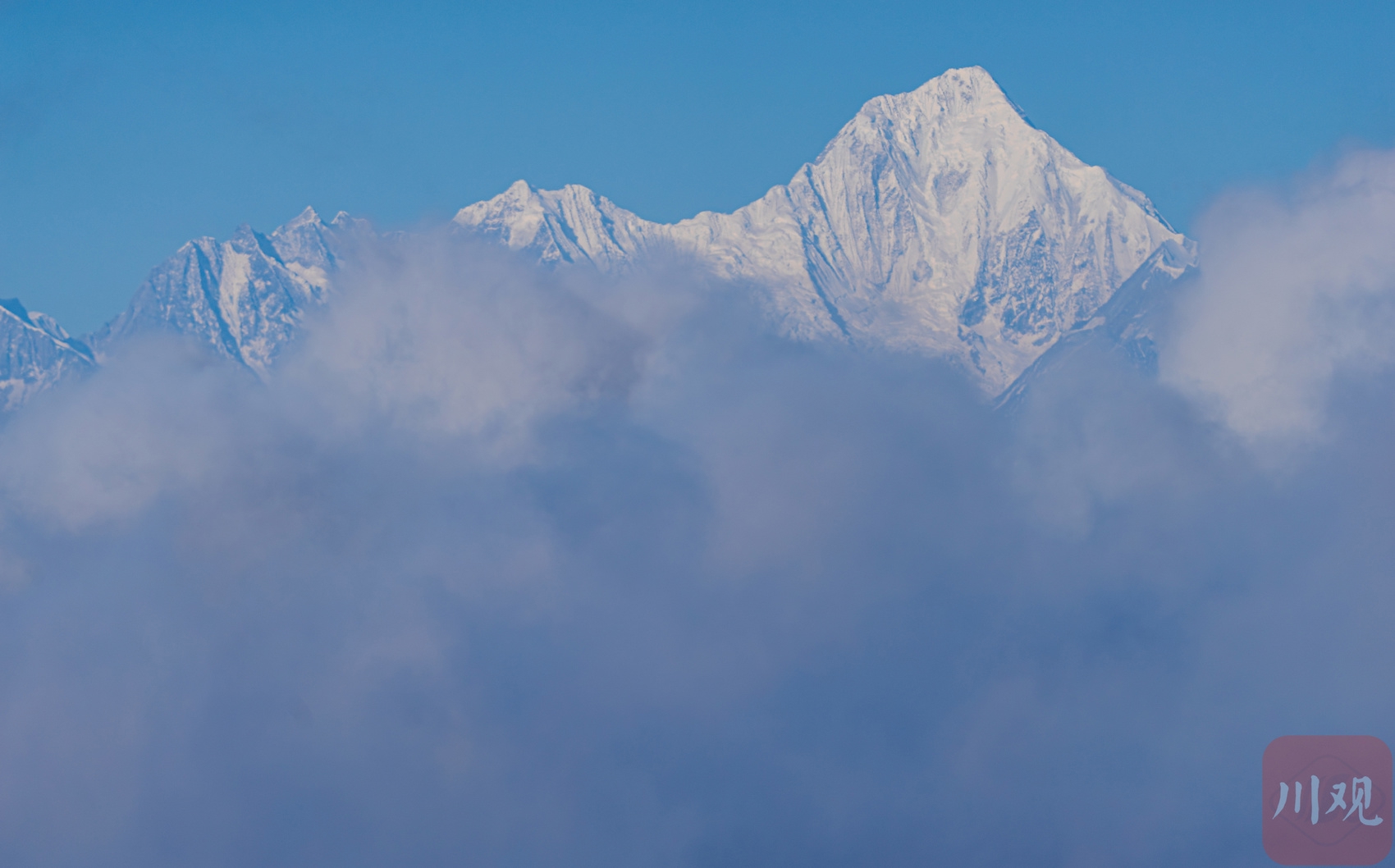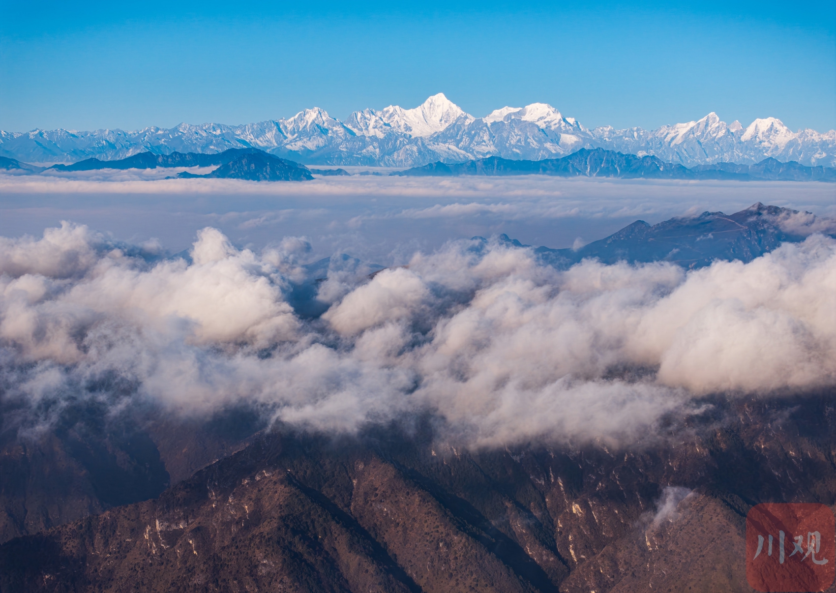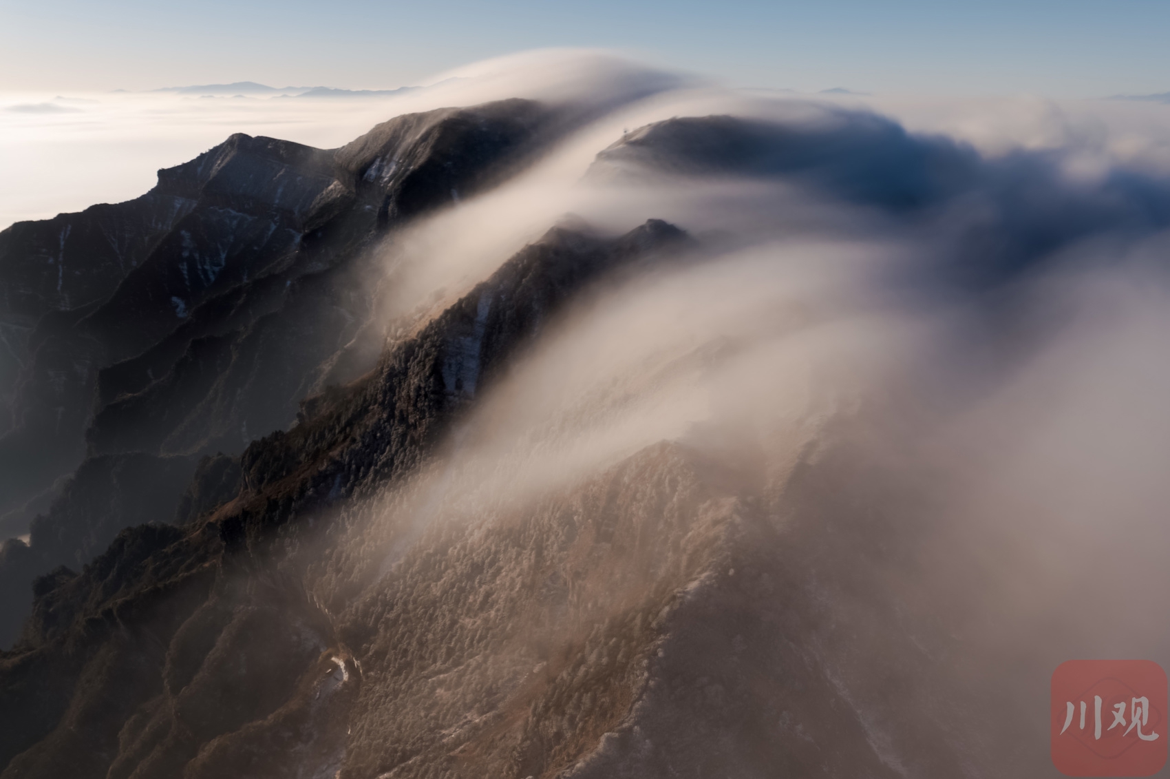12月14日清晨,雅安市汉源县马烈乡境内的轿顶山,因昼夜温差影响,在日出前后形成了壮观的云瀑。云雾沿山脊倾泻而下,时而如白帘垂挂,时而似波涛奔涌。阳光洒落时,云海与云瀑交织,构成一幅光影变幻的画卷。远处的贡嘎雪山屹立于云海之上,呈现出四川冬季独特的风光,引得现场游客纷纷驻足拍摄。