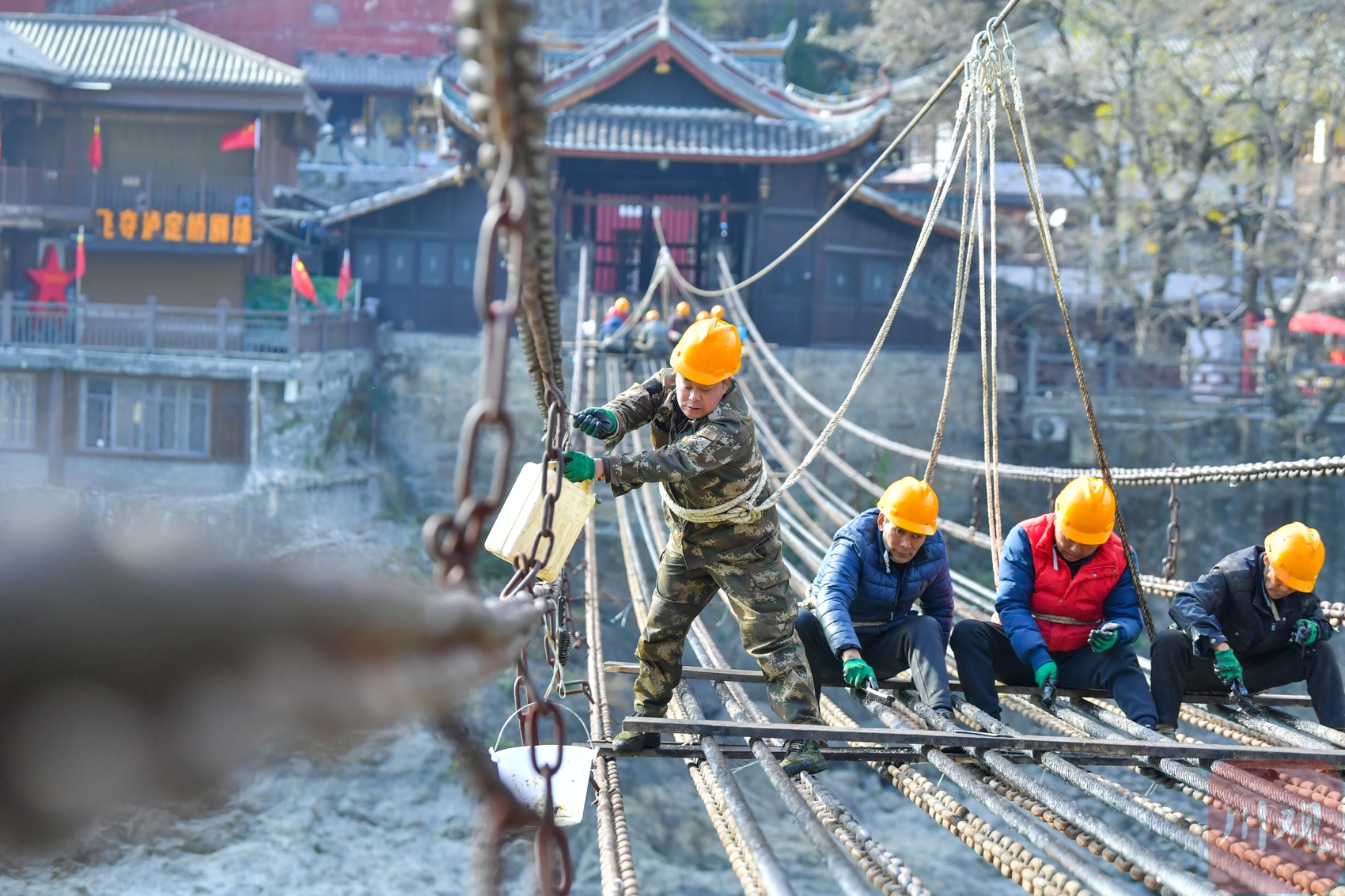2025年12月17日,四川省甘孜藏族自治州泸定县,工人在泸定桥上开展除垢清理、黄油涂抹防护等保养作业。连日来,这座横跨大渡河300余年、因“飞夺泸定桥”闻名中外的铁索桥,在冬日寒风中迎来全面“体检”——工人们以一锤一铆的慢工细活,完成铁链除垢、除锈、桥板更换等作业,同步对桥梁周边开展徒步巡查,全力守护其结构安全与历史风貌。