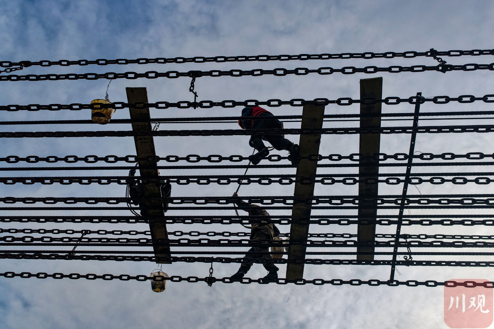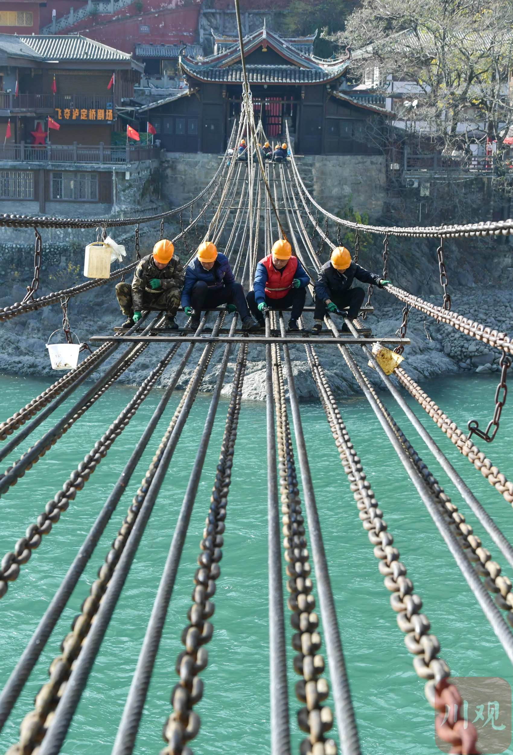 为保障全国重点文物保护单位泸定桥的结构安全及过往群众、游客通行安全,甘孜州泸定县文化广播电视和旅游局于12月9日启动本次检修维护工作,预计12月29日全面完成。泸定桥全长103.67米、宽3米,由13条铁索链构成,此次检修聚焦核心结构安全与历史风貌留存,重点对承载桥梁主体的9根钢缆进行除垢防护,对锈蚀铁链实施专业除锈,同步更换部分老化桥板,全方位消除安全隐患。