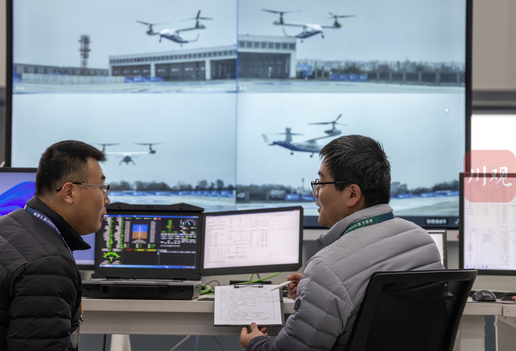 12月28日,科研人员在操控工作台监控无人倾转旋翼飞行器镧影R6000的飞行。
