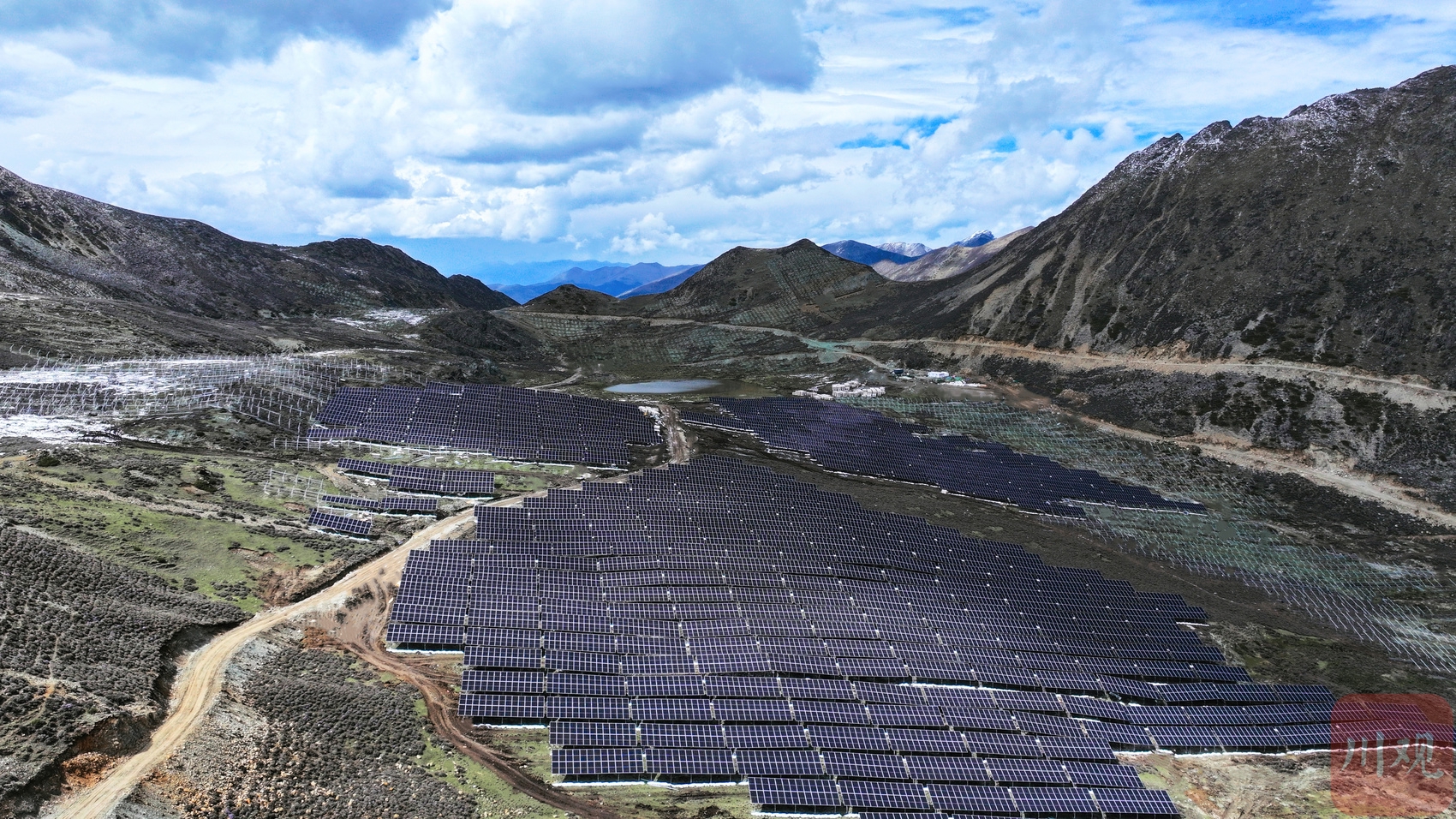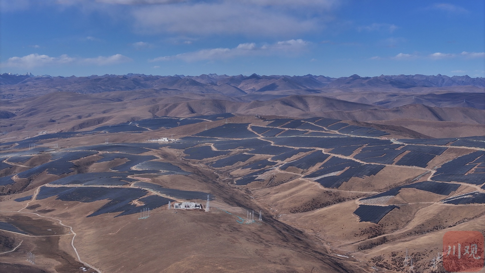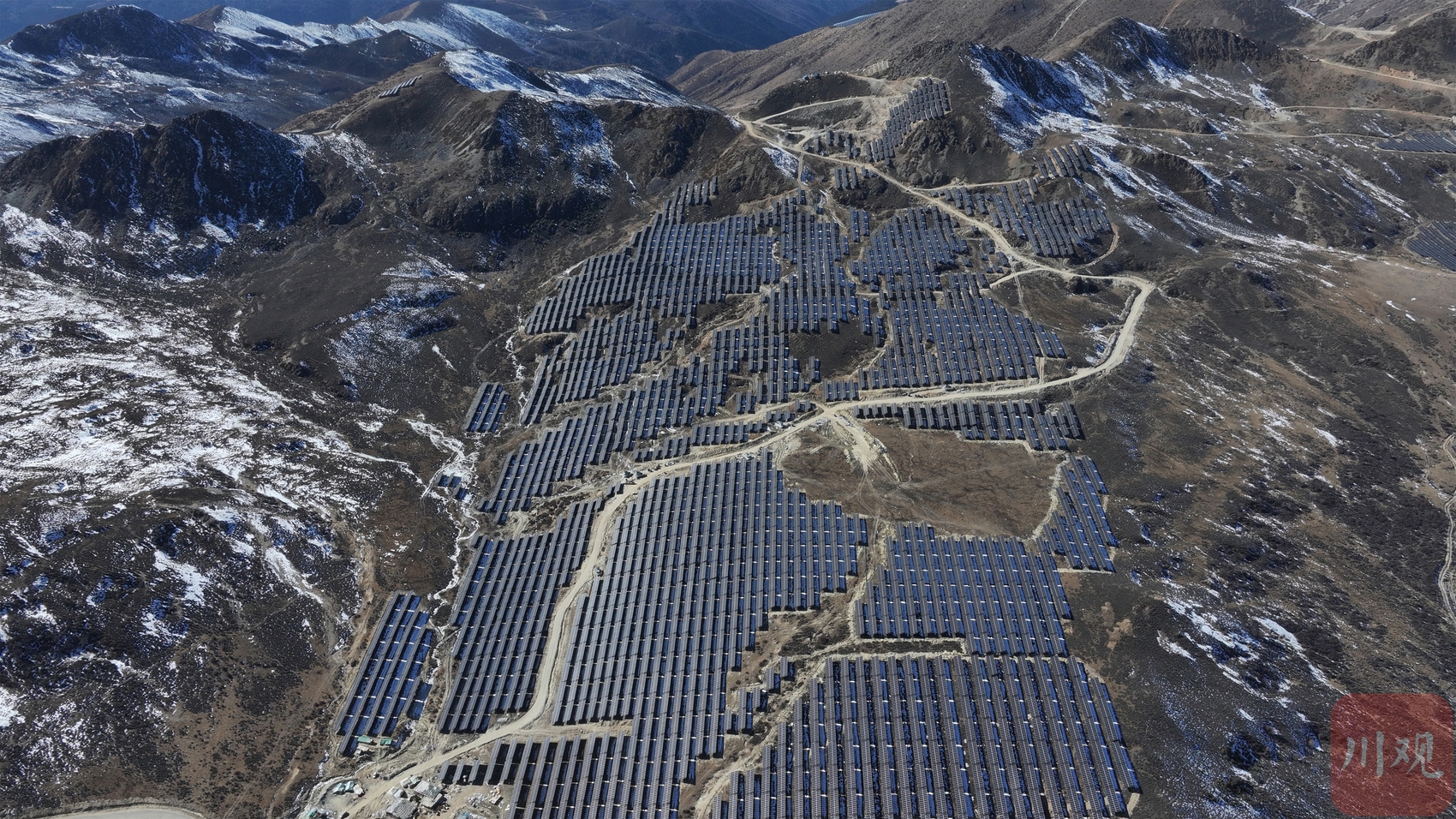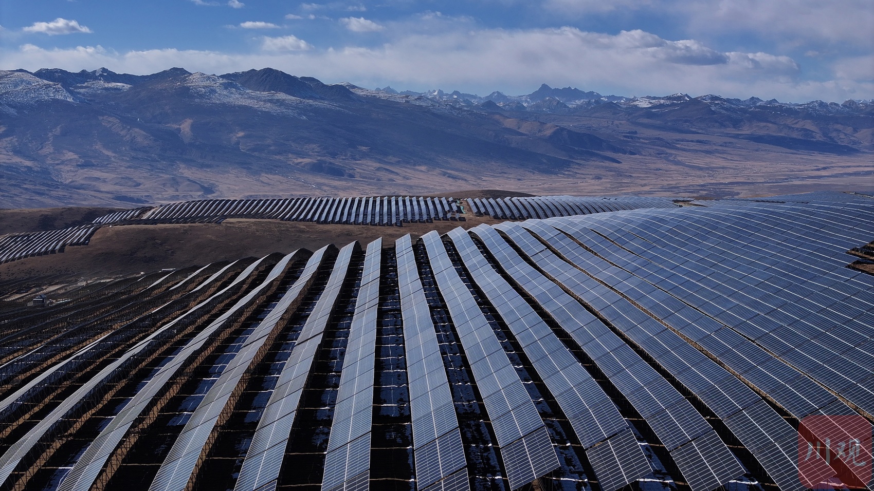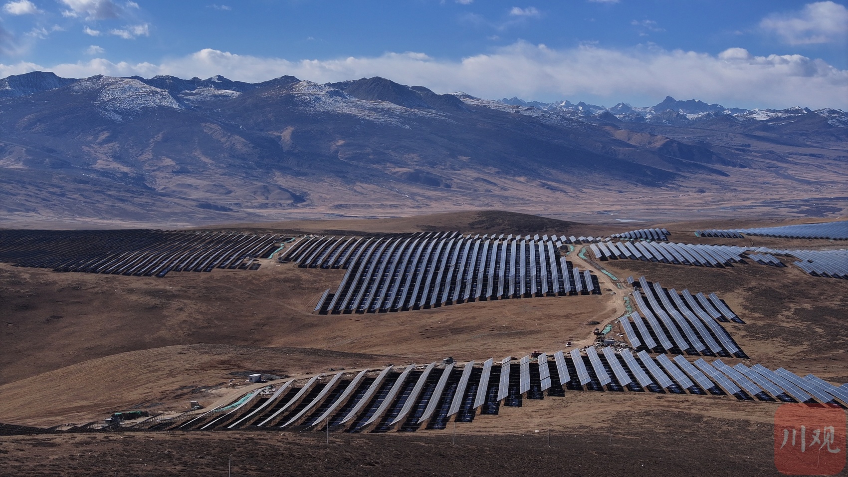 眺望索绒光伏电站发电单元阵列与远处的雪山
