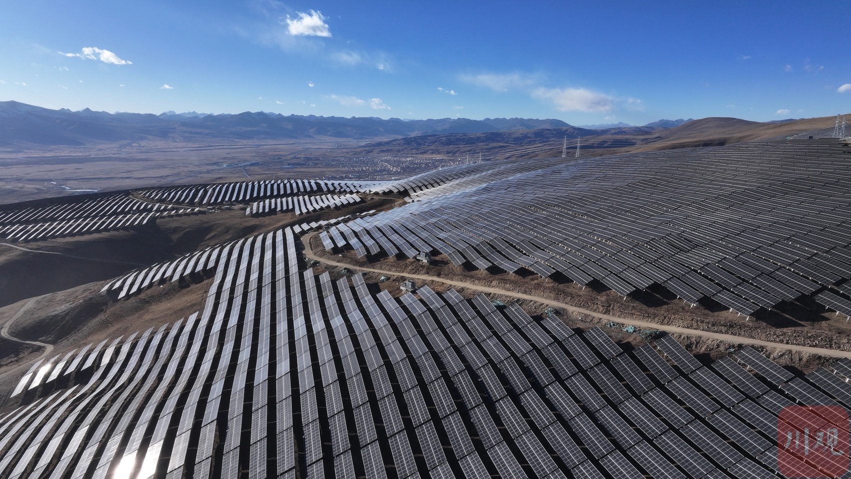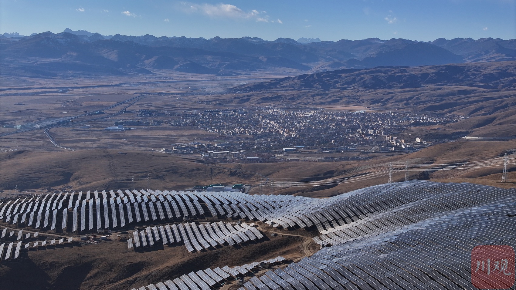 索绒光伏电站发电单元阵列与远处的理塘县城遥相呼应