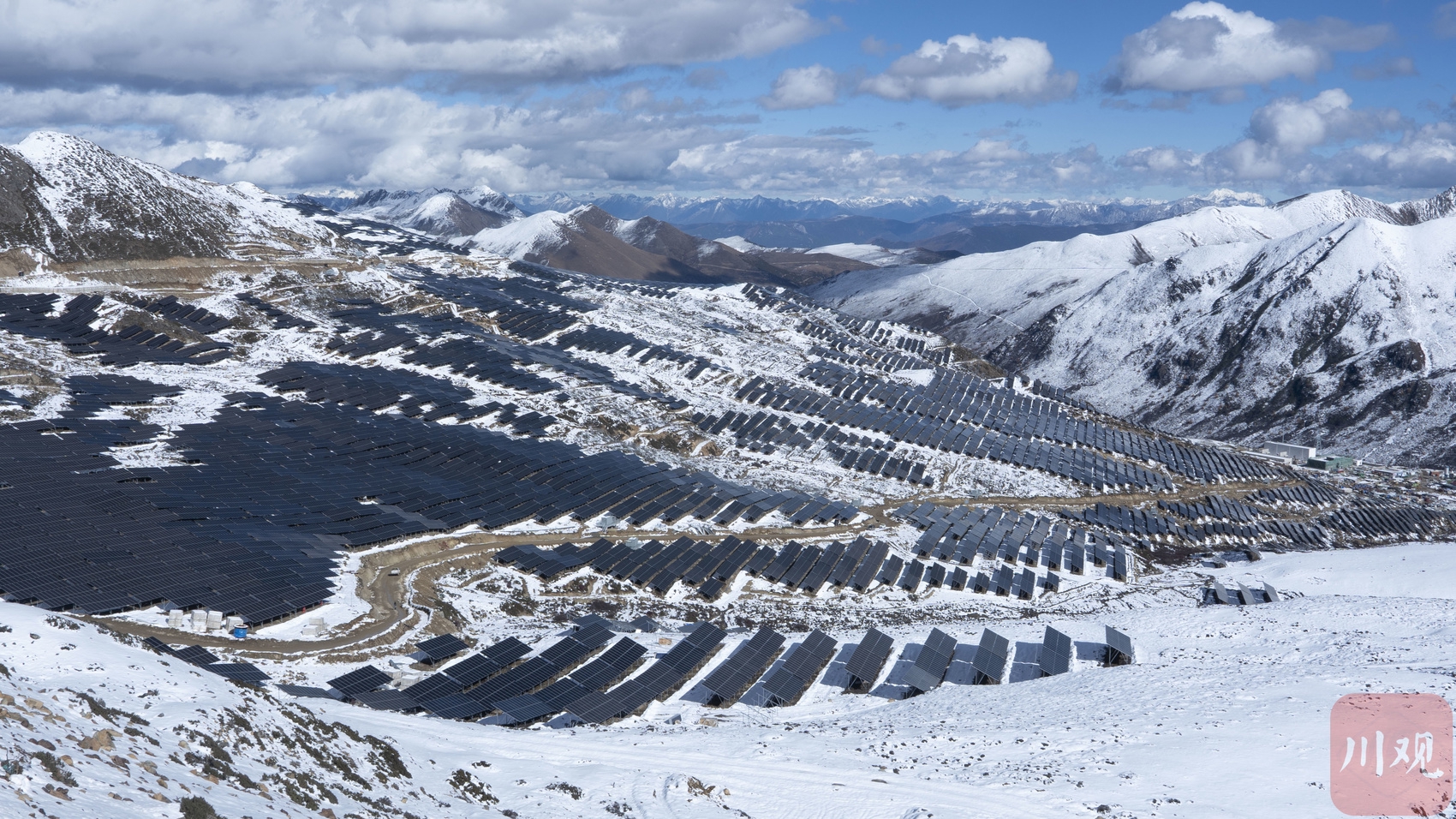 与雪山齐平的茶布朗光伏电站,电站平均海拔4400米,最高海拔都达到了4700米。