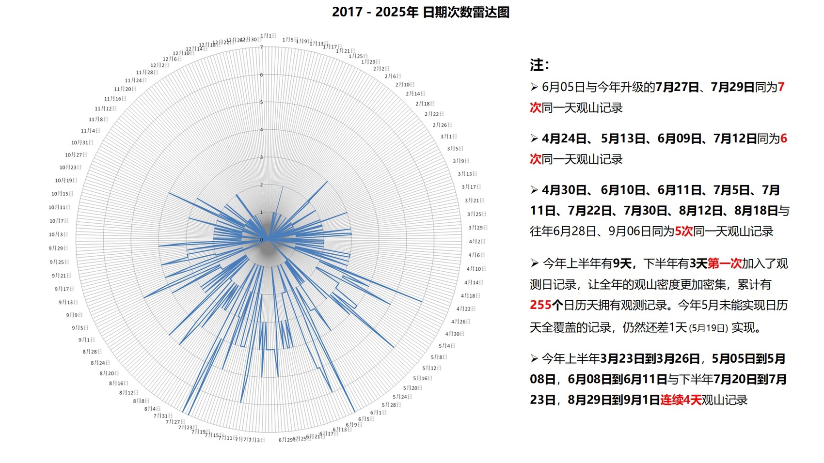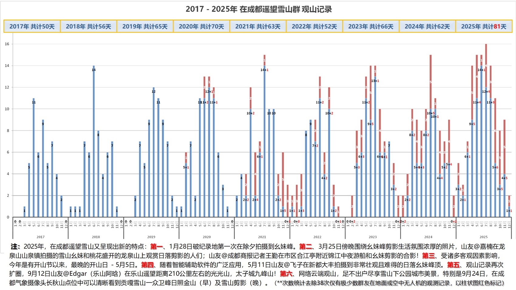 1月28日除夕,在成都首次观测到幺妹峰,打破了9年的观山纪录,为全年拉开浪漫序幕;3月出现全年首次连续观山小高峰,人们在春暖花开中与雪山同框合影;5月5日,大家期盼已久的“开山节”终于到来,幺妹峰、大雪塘等一众雪山华丽现身;7月观山次数登顶,观测次数达109次;3月、5月、6月和7月,多次出现连续4天观山的 “狂欢时刻”。作为成都遥望雪山的“双C位”,贡嘎与幺妹峰分别出现了13次和47次之多,成都追山人的朋友圈里,溢满了雪山下公园城市的幸福记忆。