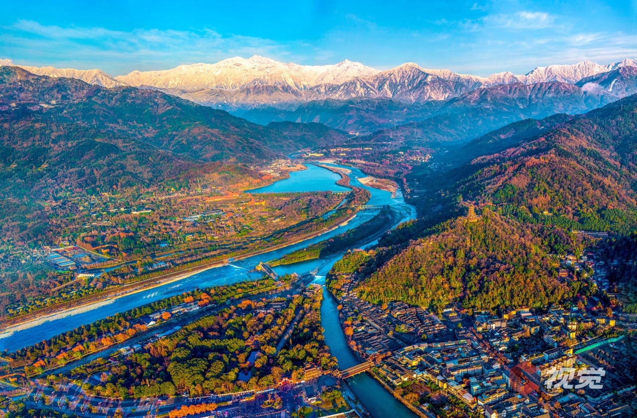12月7日,大雪节气,在今年正式列入世界灌溉工程遗产名录的彭州市湔江堰遥望龙门雪山。C视觉签约摄影师 张勇