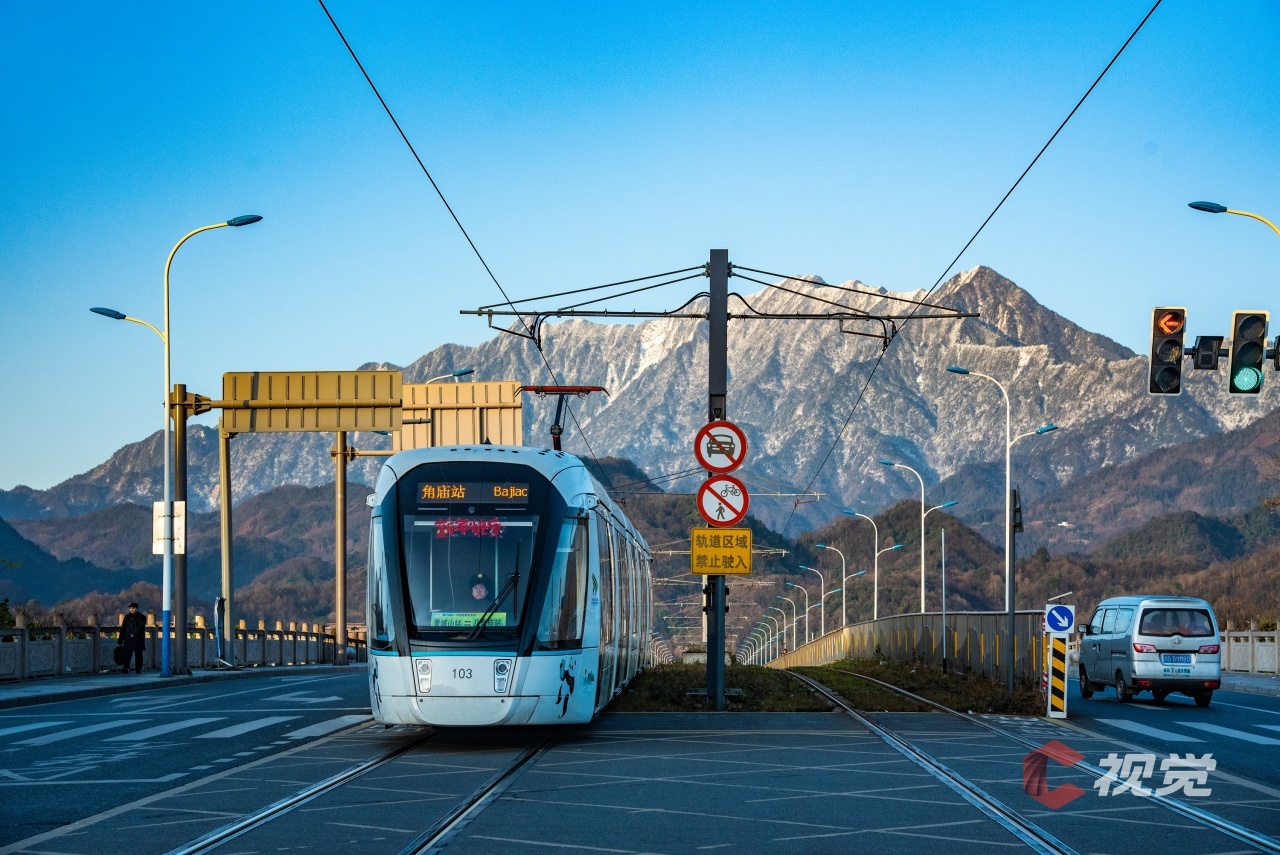 1月28日除夕当天,雪山下行驶的都江堰轨道旅游列车带着新年的问候,驶向新的一年。C视觉签约摄影师 周新联