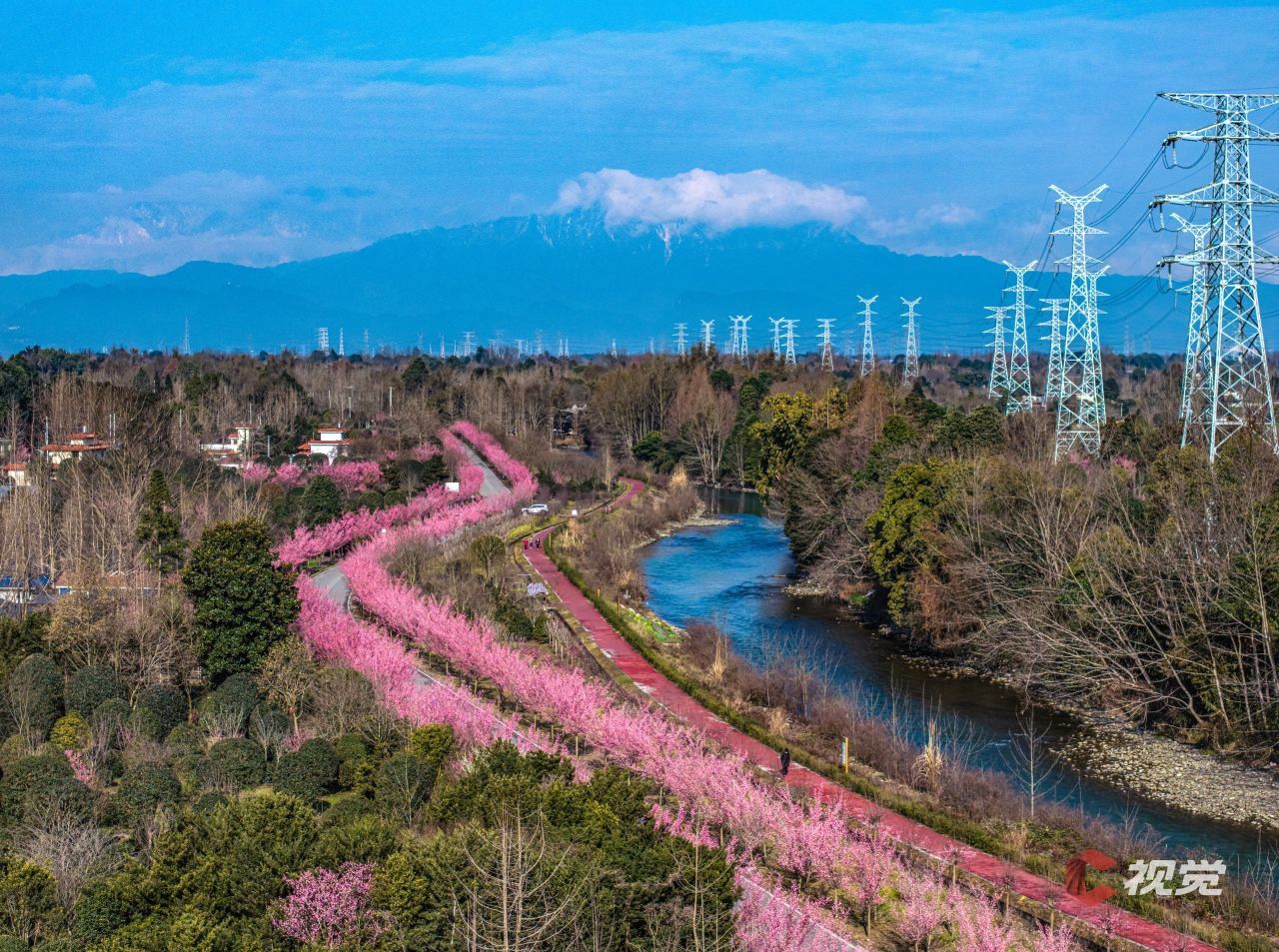 2月25日,成都温江区北林绿道红梅绽放,雪山显露云端。C视觉签约摄影师 张礼彬