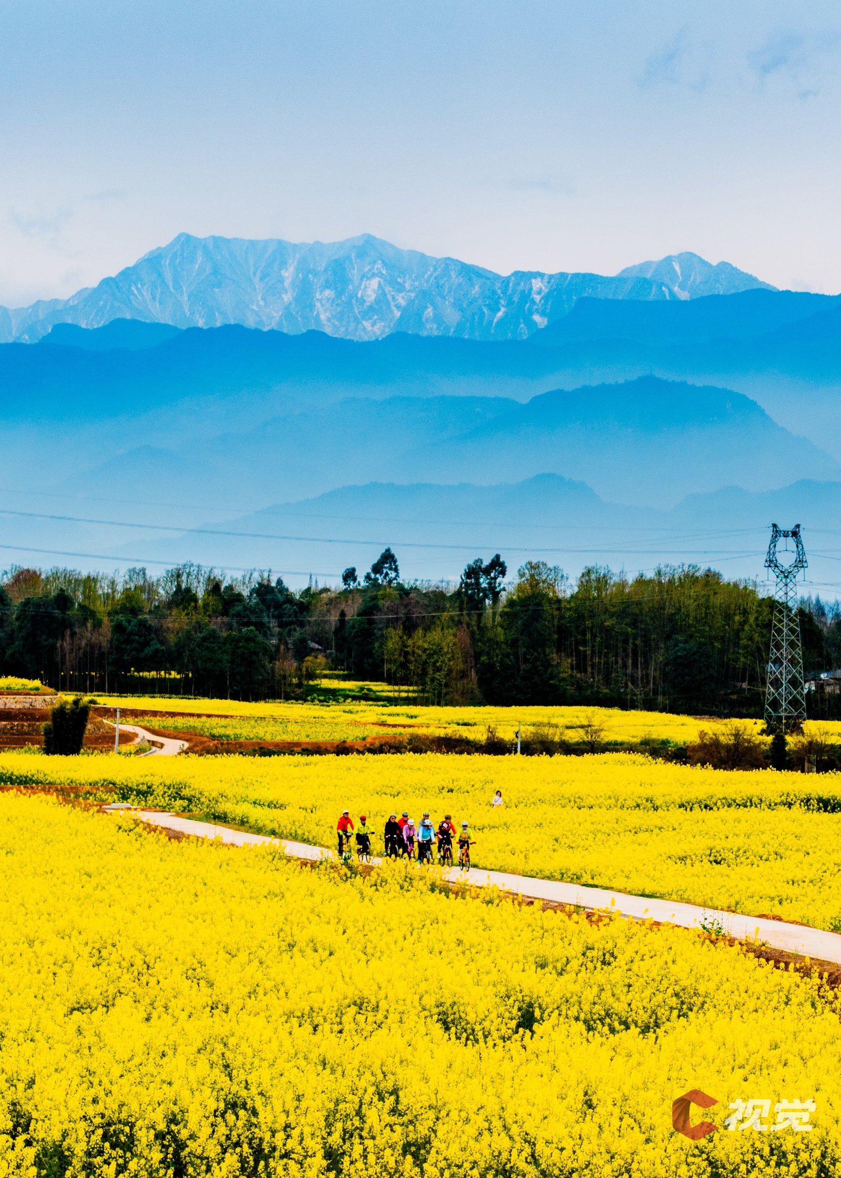 3月18日,崇州市怀远镇花果山油菜花正在盛放,远处雪山皑皑,骑行爱好者穿行在金色花海里。C视觉签约摄影师 李旭