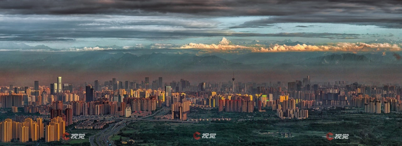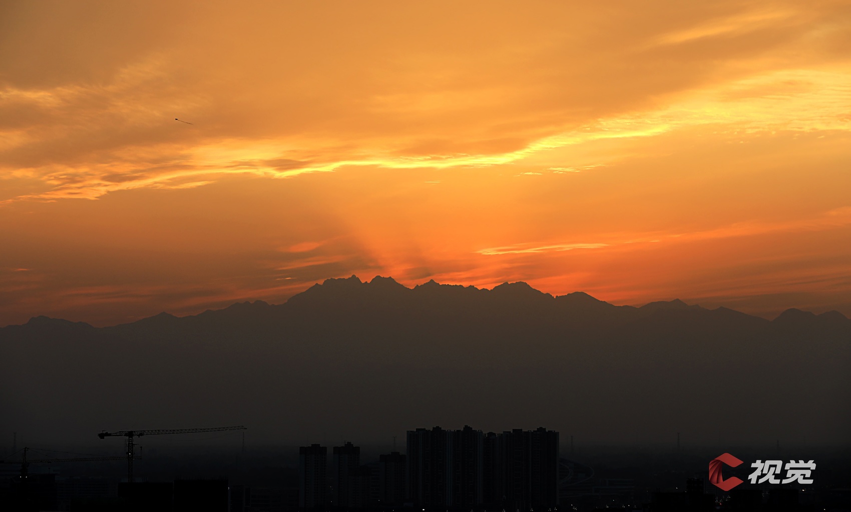 9月12日傍晚,成都高新区又见雪山,晚霞中群峰剪影俯瞰整个城市。C视觉签约摄影师 蒋光丛