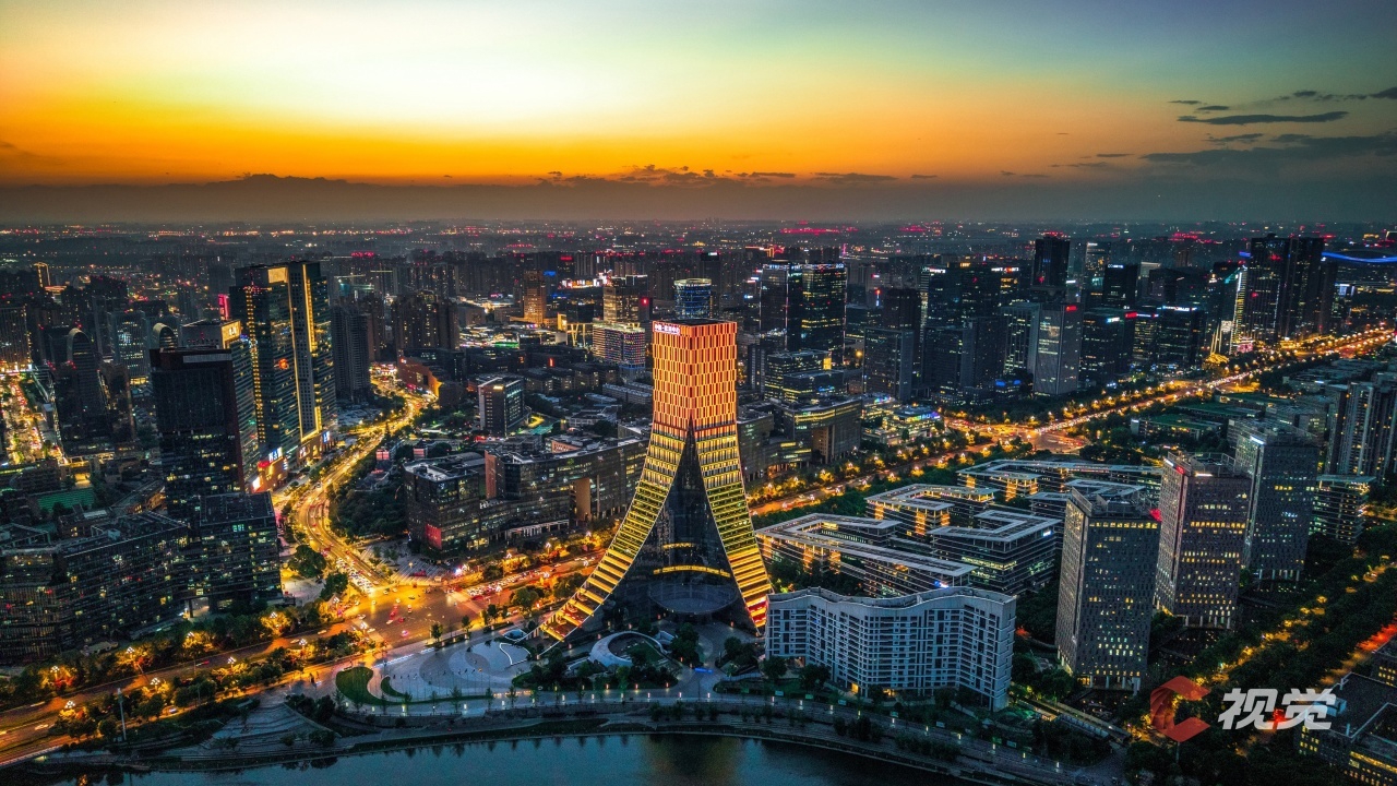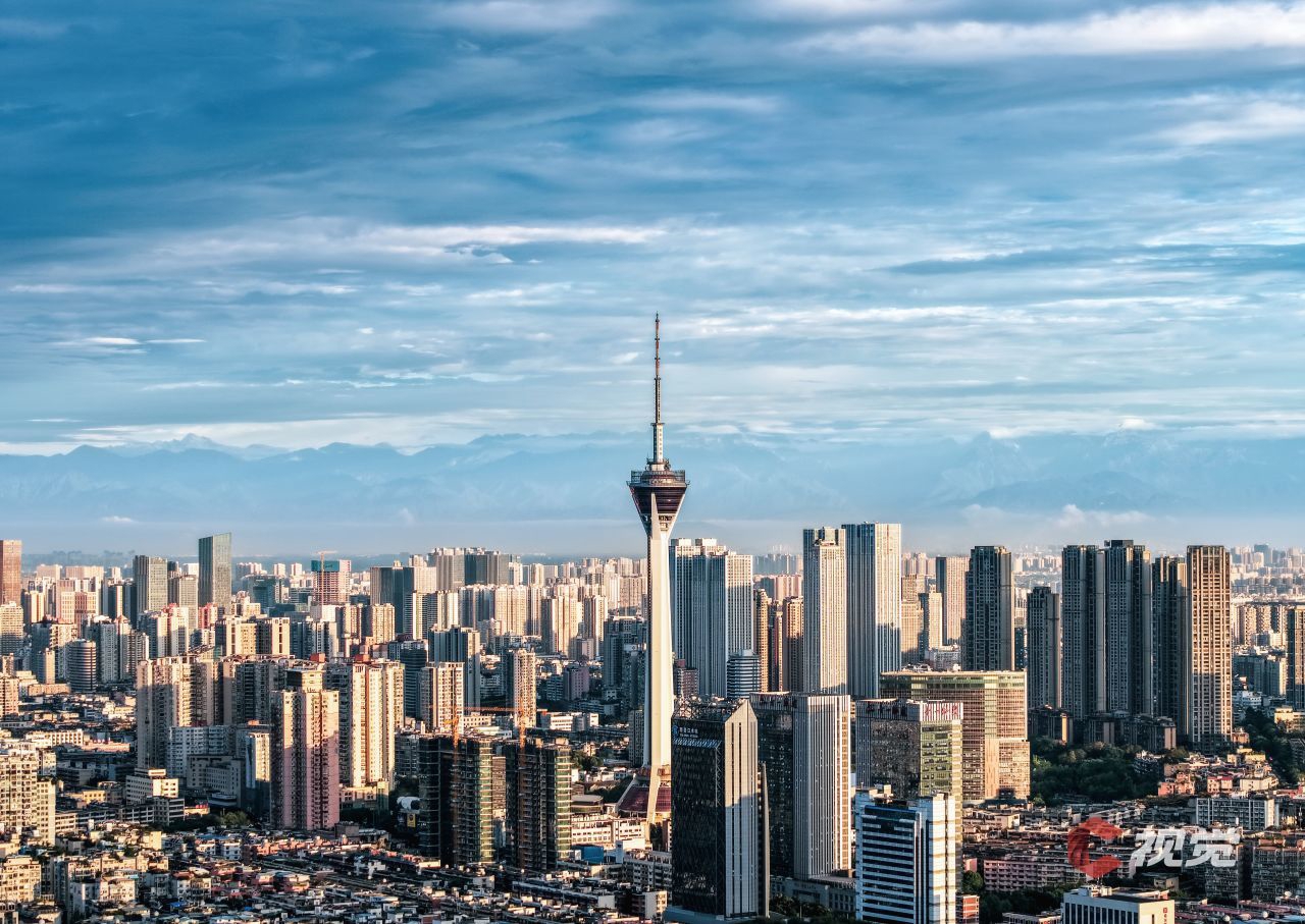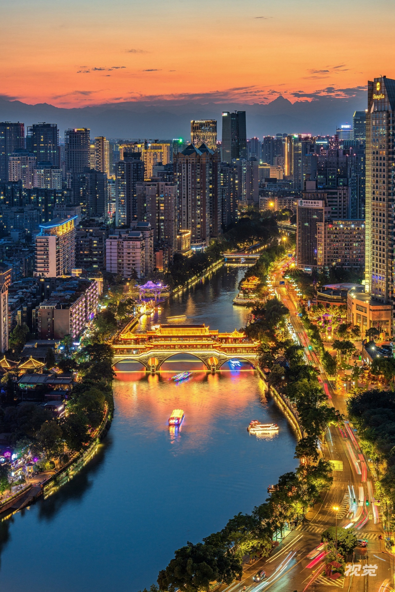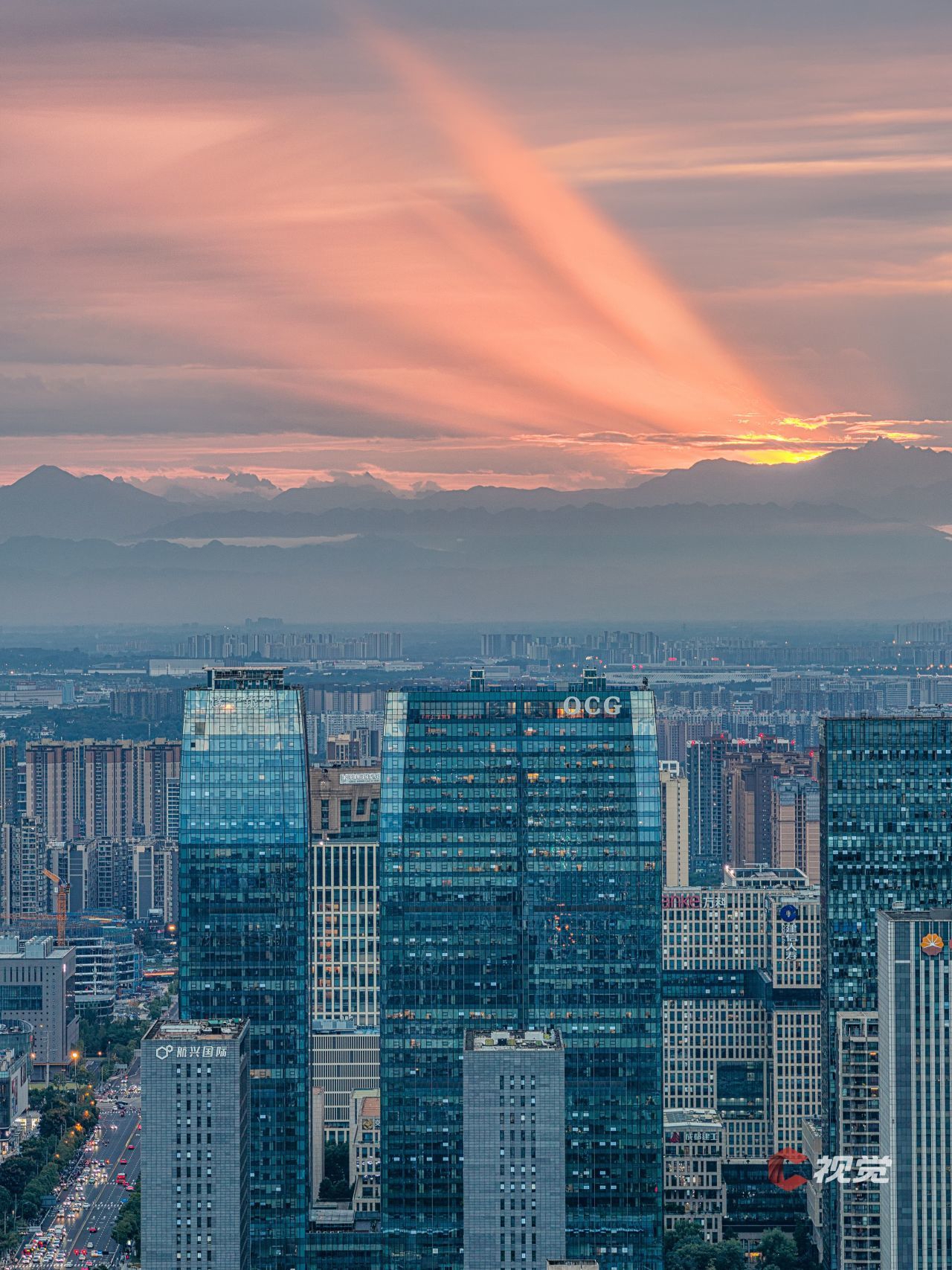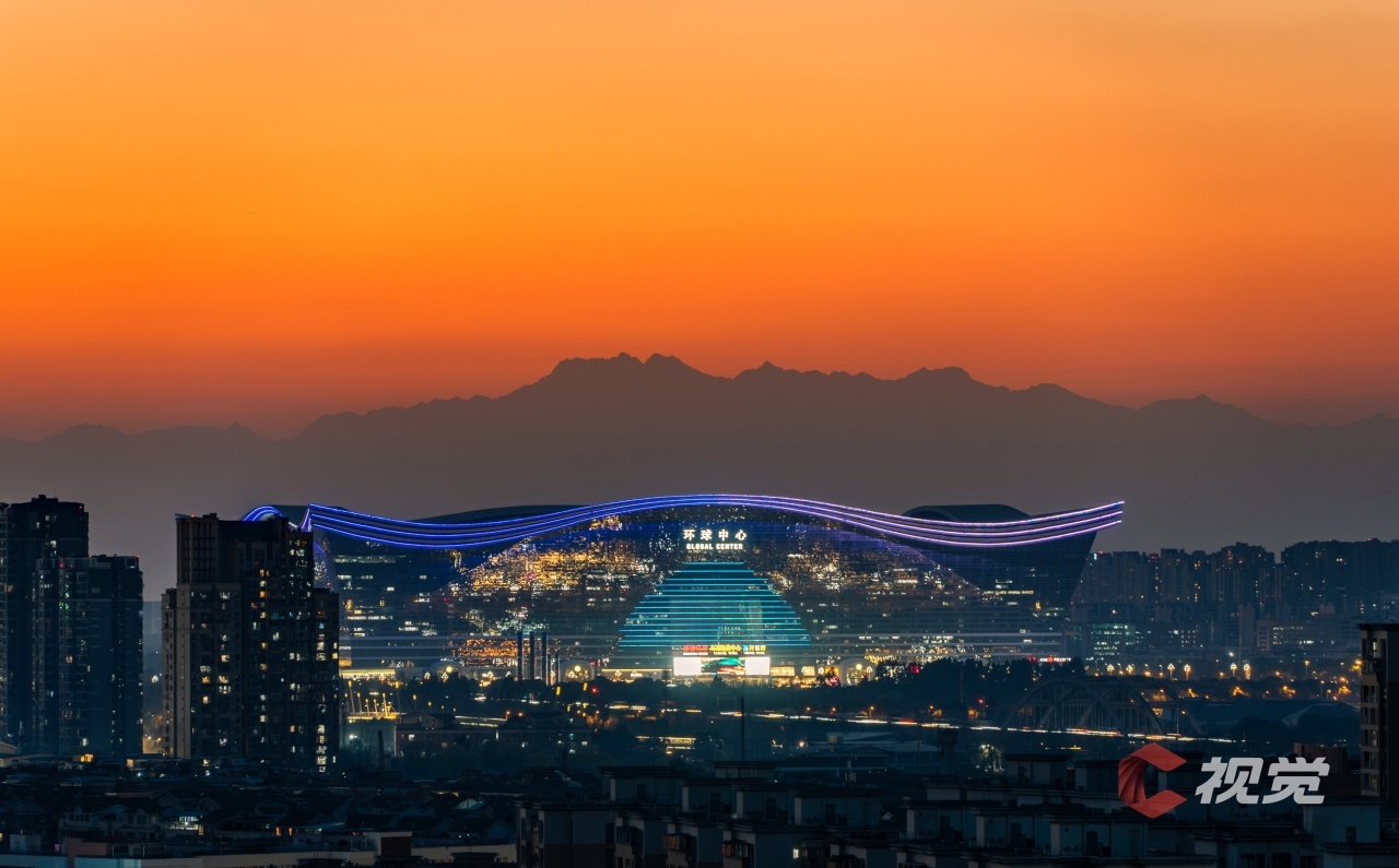 4月30日,高新区的写字楼群玻璃幕墙折射着流动的光轨,远处大雪塘与幺妹峰浮在靛蓝暮色中。C视觉签约摄影师 张翔升