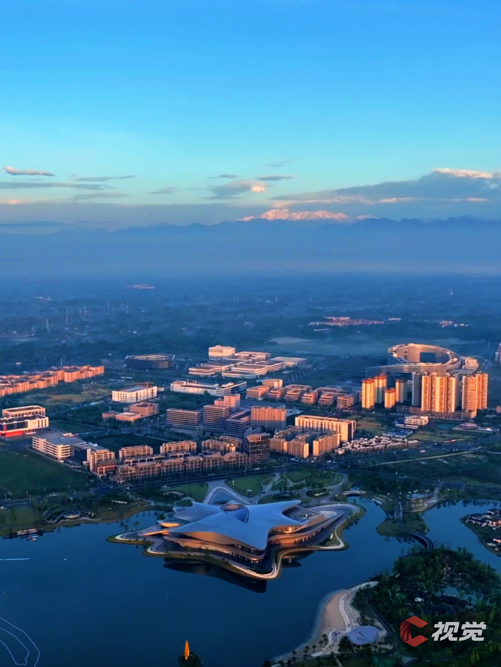 10月13日,成都地标天府熊猫塔在雪山的映衬下彰显着雪山下公园城市的蓬勃和灵秀。C视觉签约摄影师 廖芳
