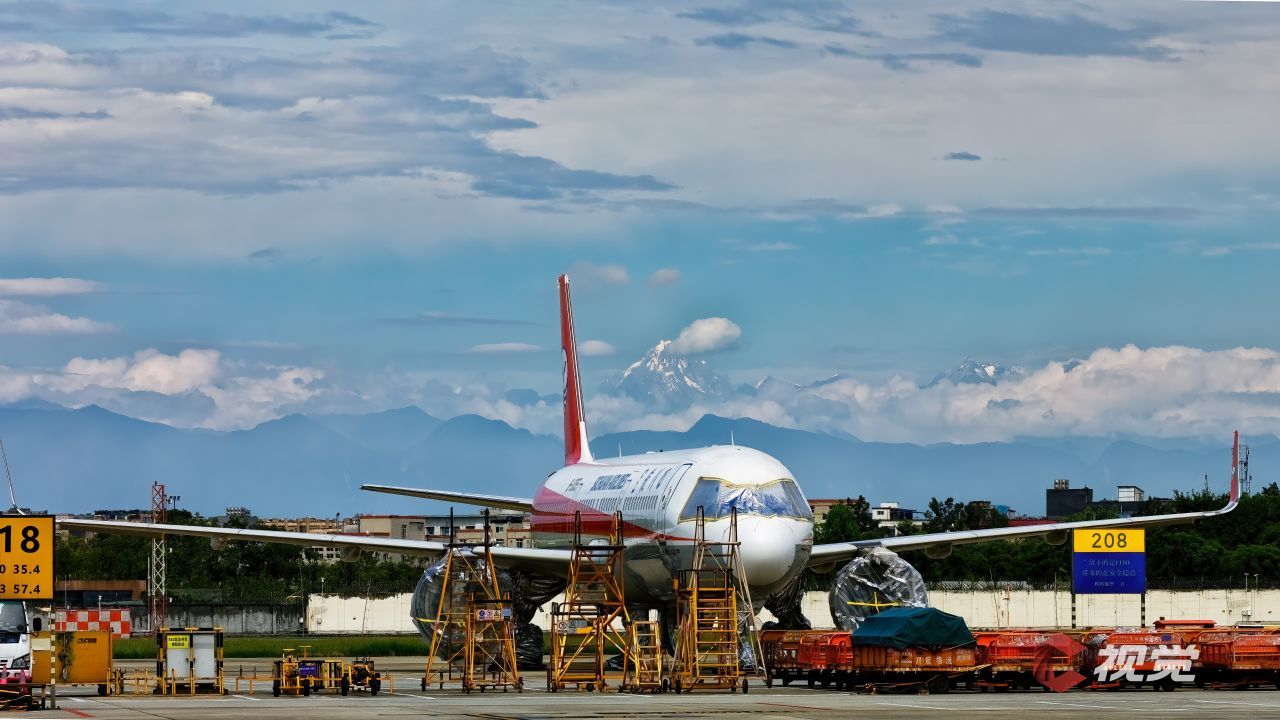 8月18日中午时分,在成都双流机场,看幺妹峰与飞机同框。C视觉签约摄影师 蒋松