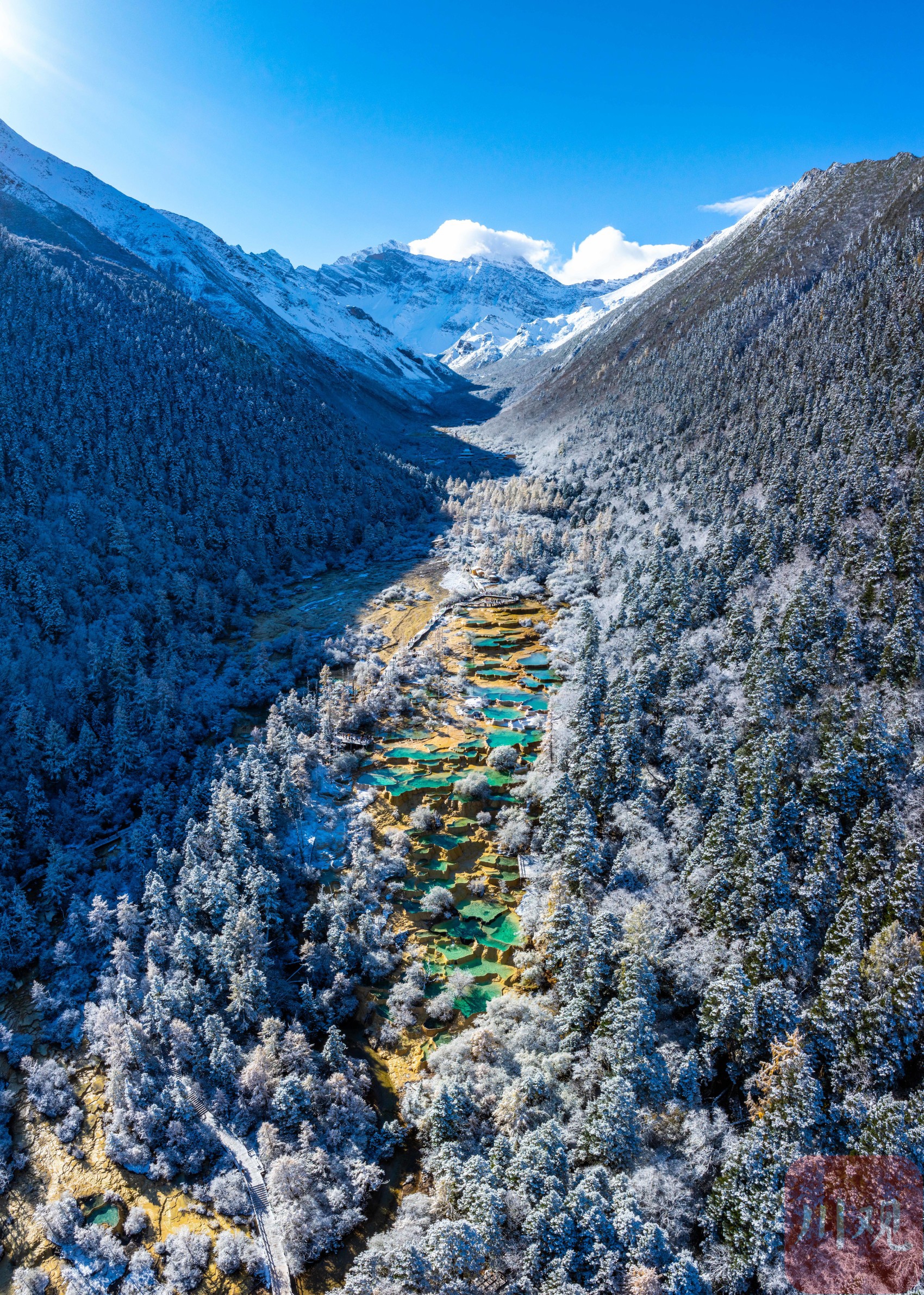 1月6日,航拍雪后的黄龙景区。