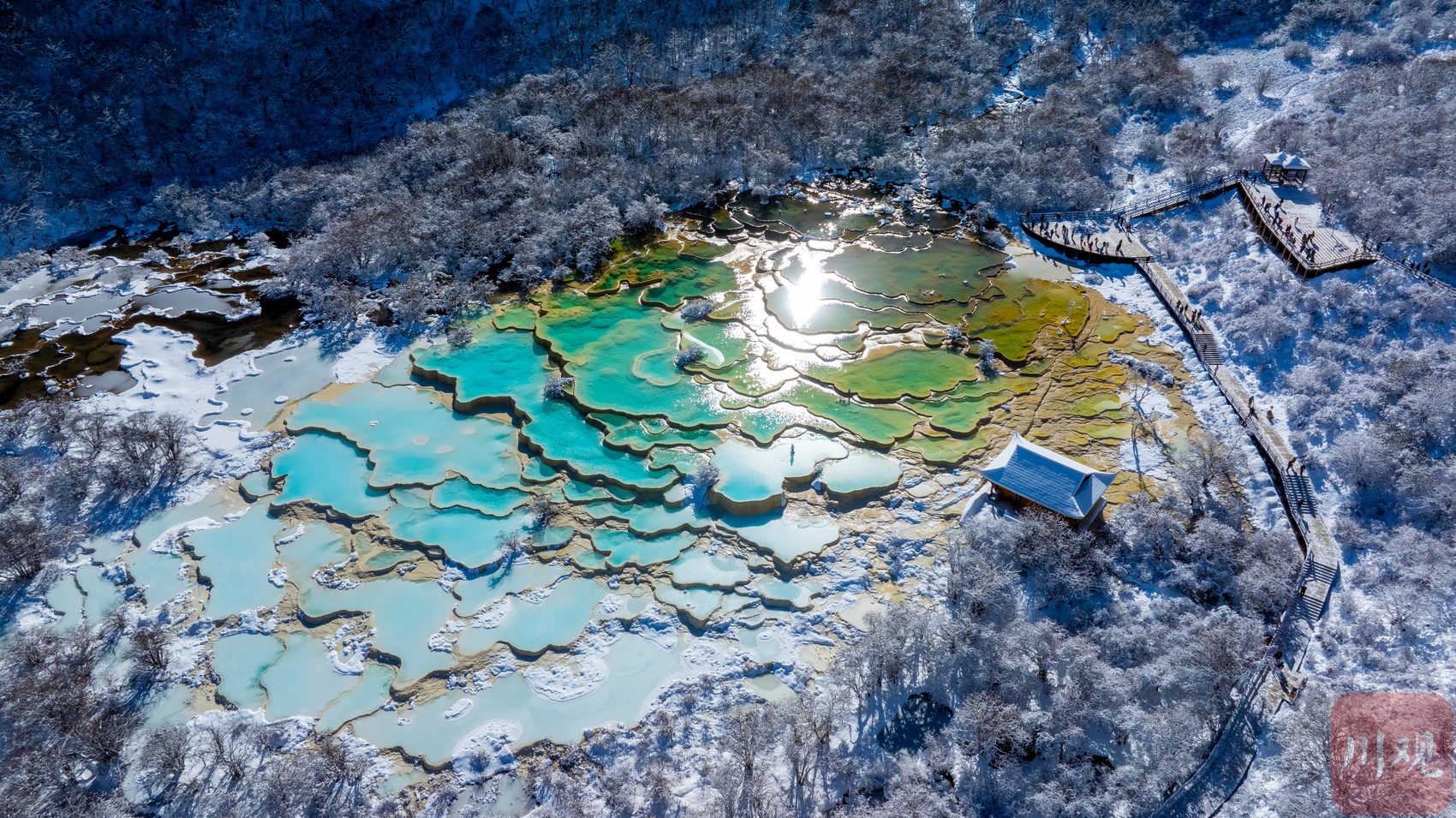 1月6日,大雪覆盖了黄龙景区,彩池在白雪映衬下更显青绿,还有四周栈道、原始森林、钙华、瀑布、古寺,积雪后呈现另一番动人景象。晶莹剔透的雪花,与自然景观交织形成特别的画卷,蓝绿、明黄、浅白等颜色相互交织,仿佛是大自然的调色盘。