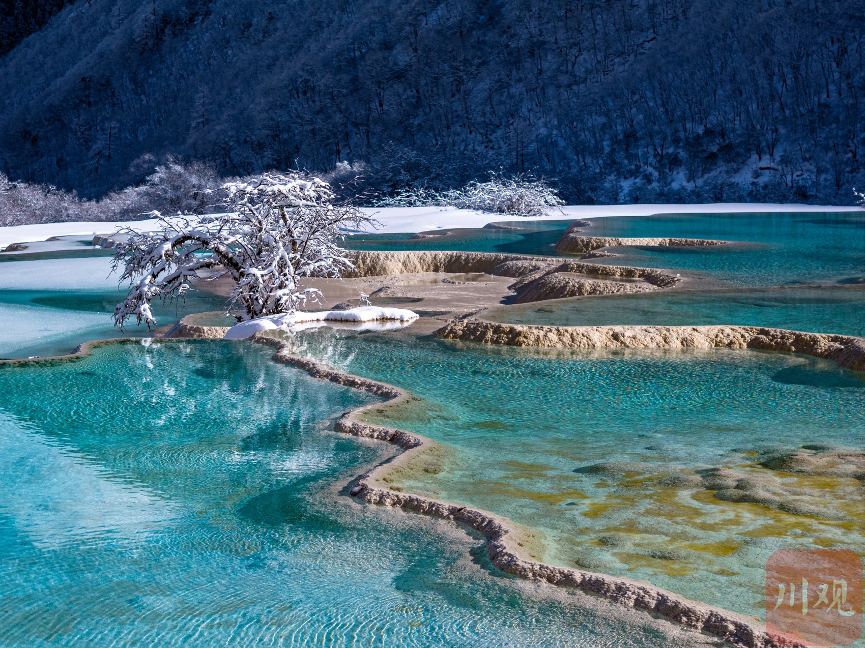 1月6日,雪后的黄龙景区,蓝绿、明黄、浅白等颜色相互交织,仿佛是大自然的调色盘。