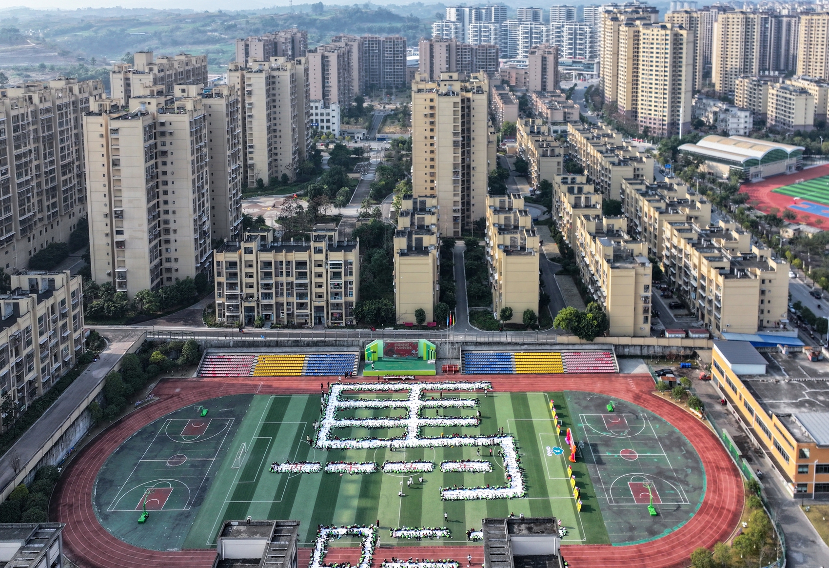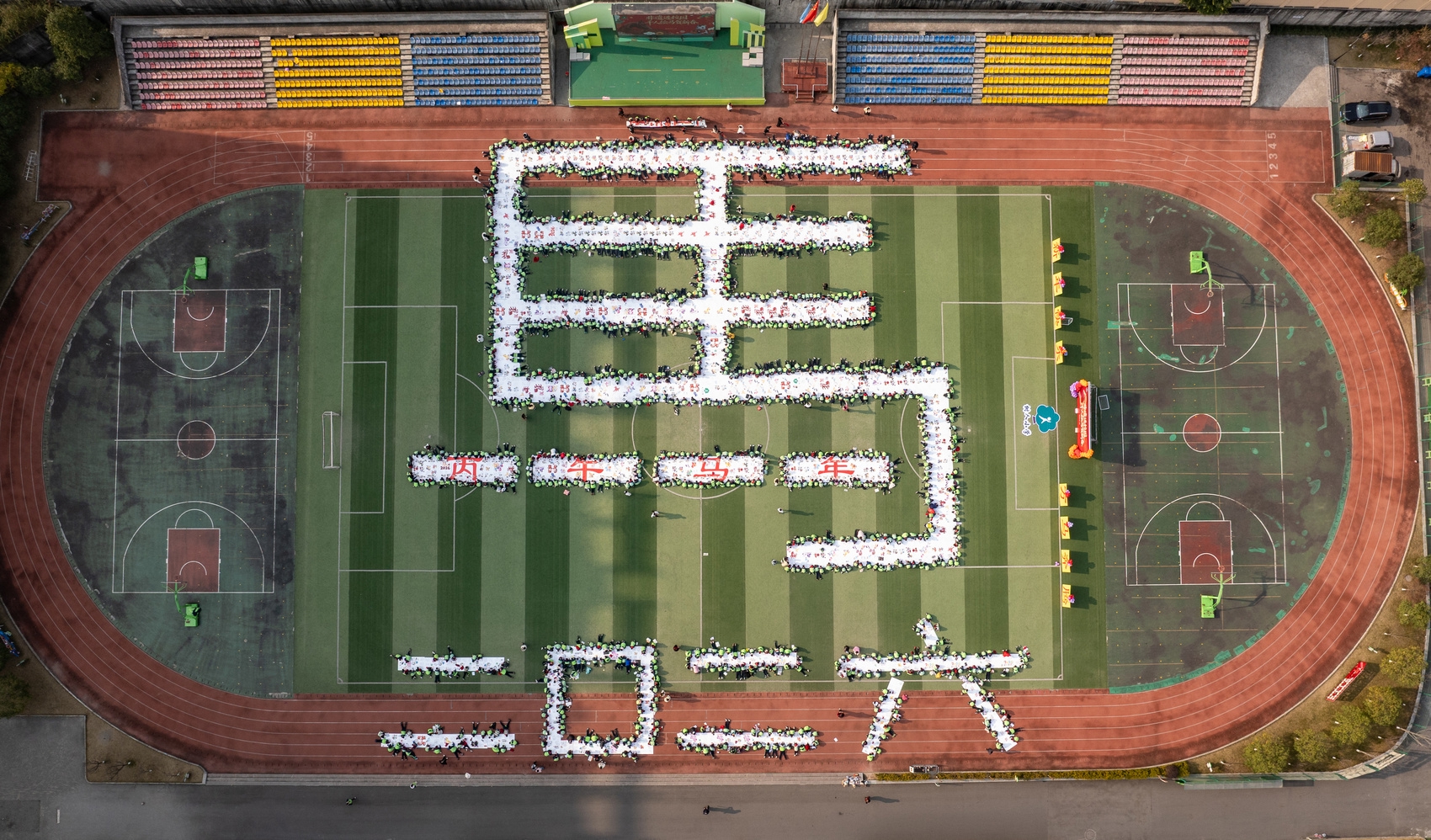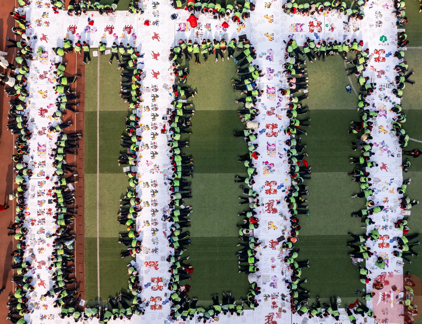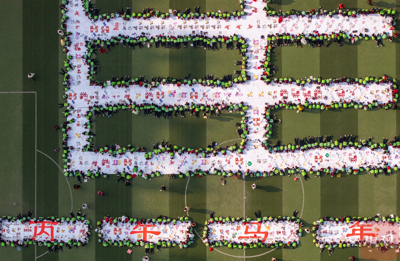1月14日,自贡市荣县树人小学校的绿茵场上,一幅巨型“马”字图案逐渐清晰——千余名师生以身体为“笔”、色彩为“墨”,在预设的“马”字轮廓中,通过纸绘、陶板绘等多种形式共同创作,最终完成这幅千米长卷上的巨幅骏马图。这是该校专为迎接农历马年打造的“非遗进校园 千人绘马贺新年”特色活动,让传统年俗在校园里焕发新活力。