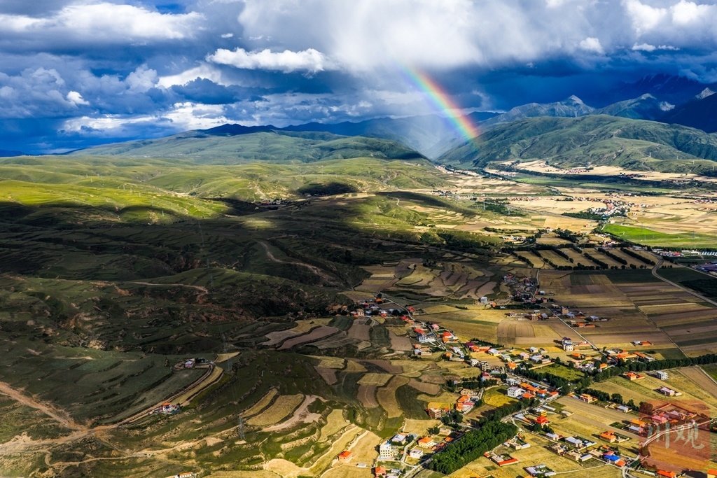 甘孜县拖坝乡移民扶贫新村,在雨后彩虹的装点下,宛如一幅色彩斑斓的油画。