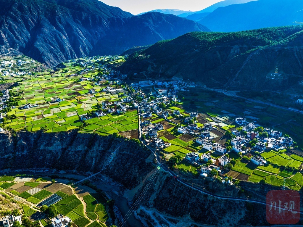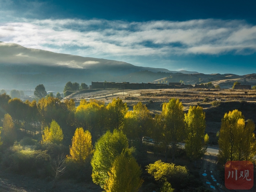 晨曦初露,万丈霞光为甘孜县的乡村大地披上 “金衣”。