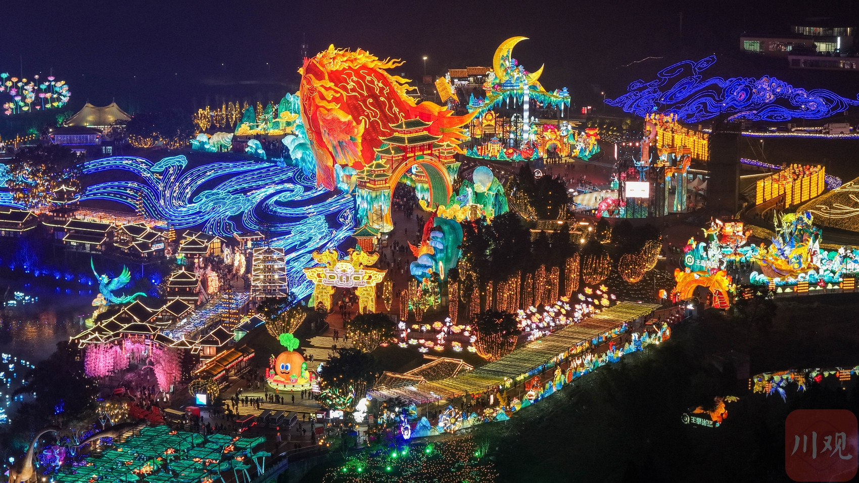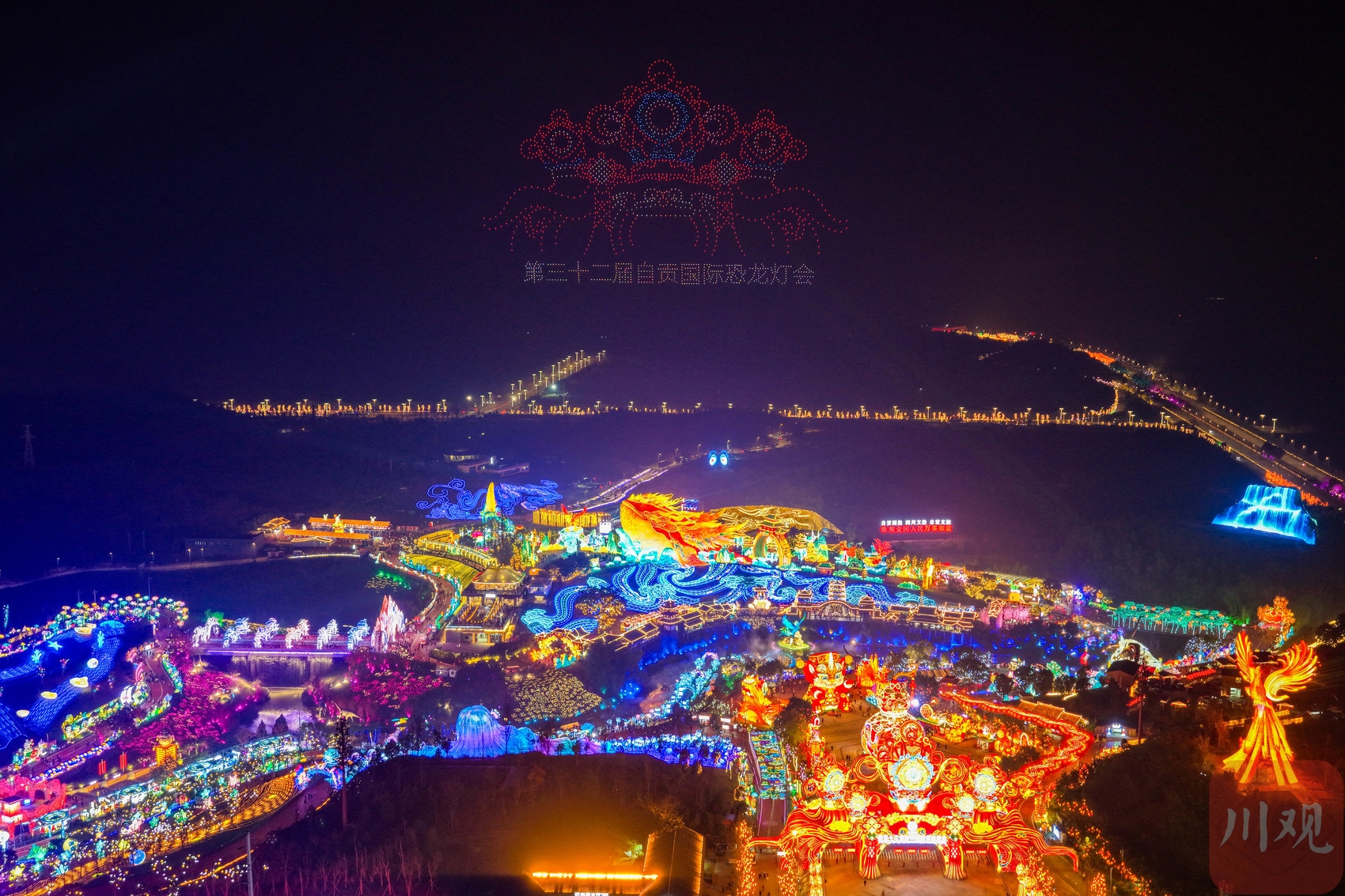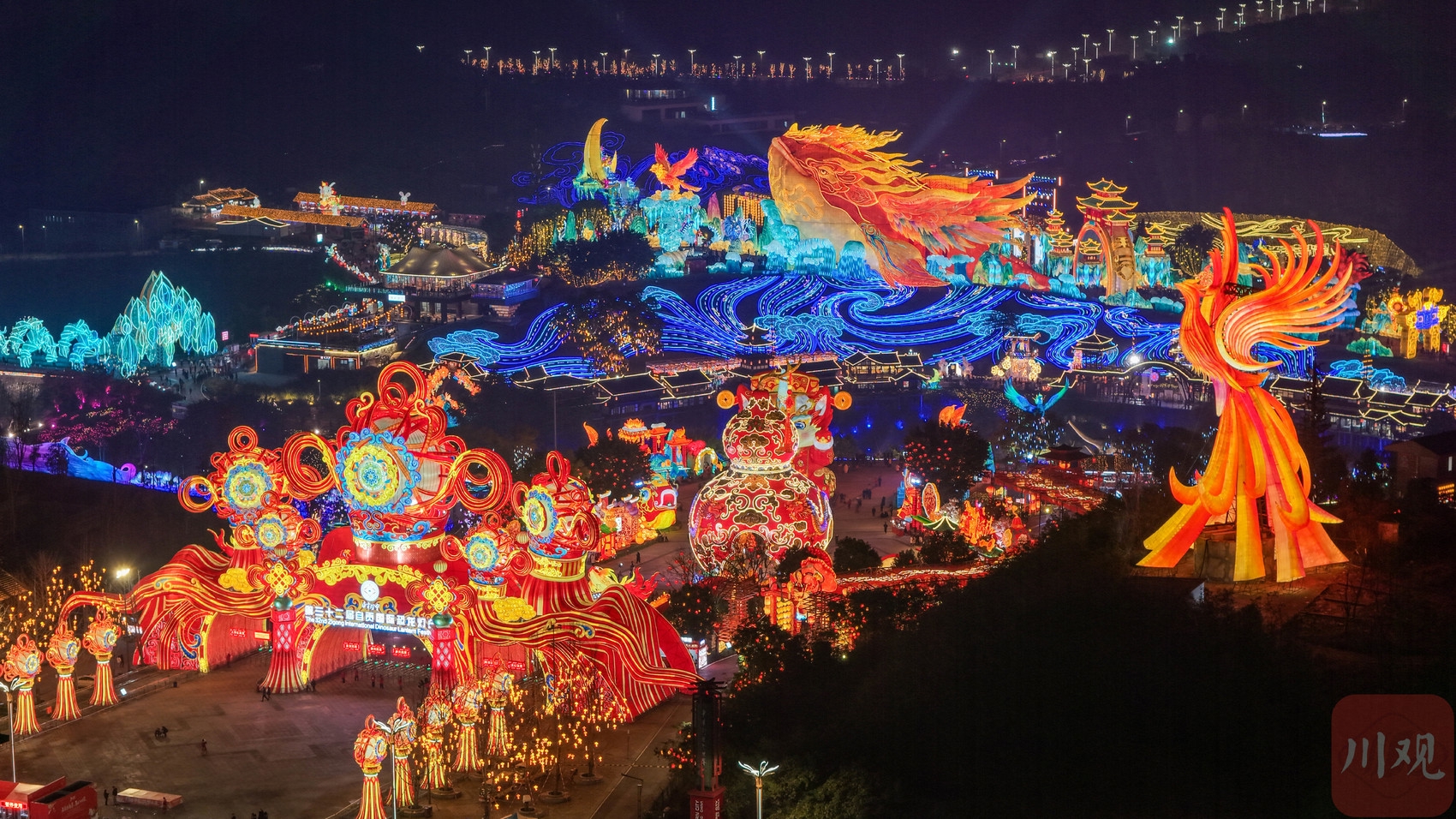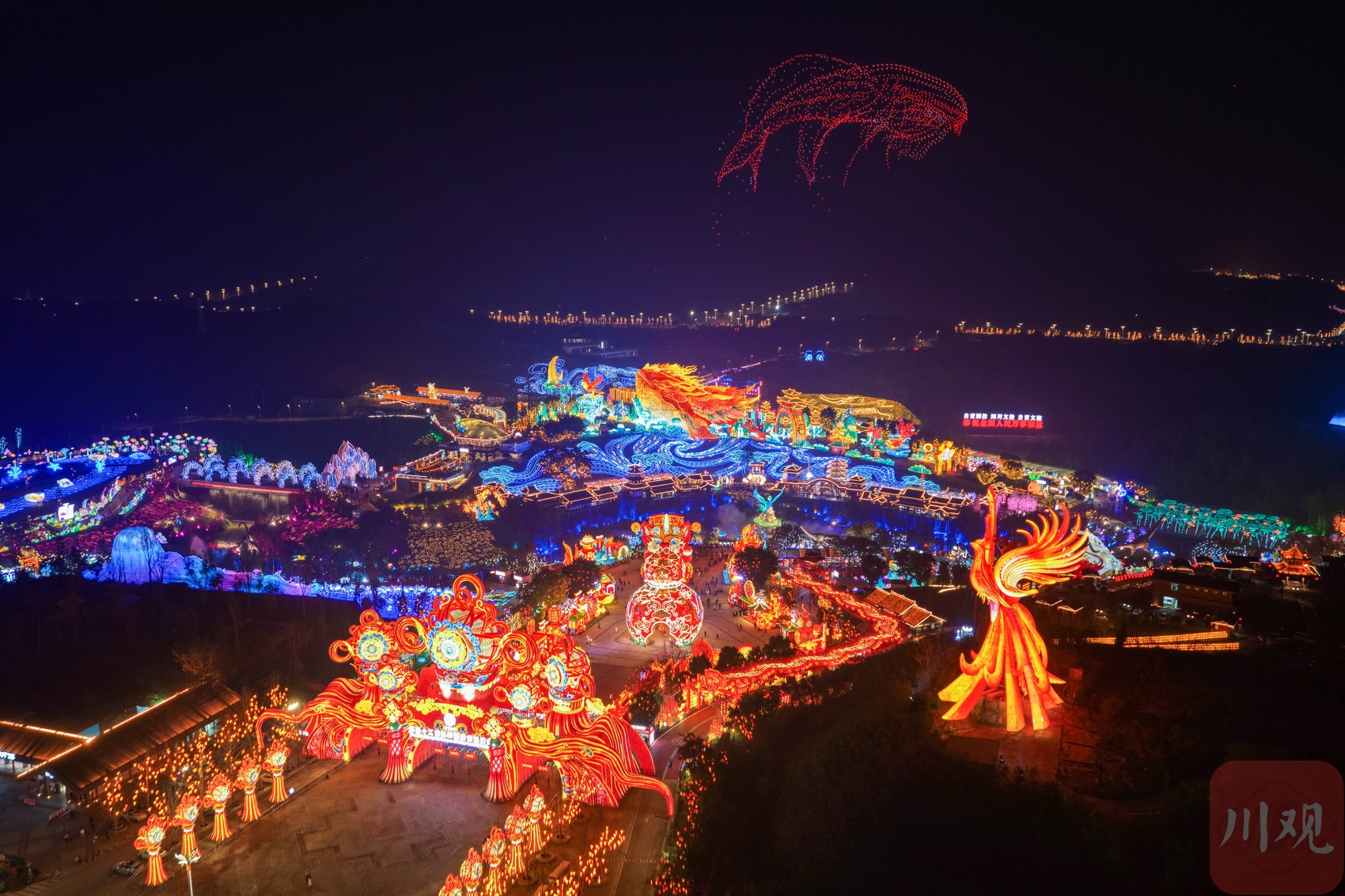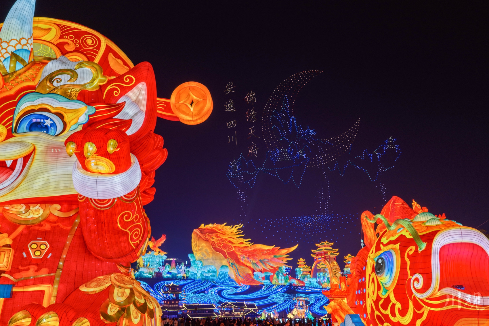 无人机编队在灯会上空交织出“安逸四川·锦绣天府”的璀璨图景。