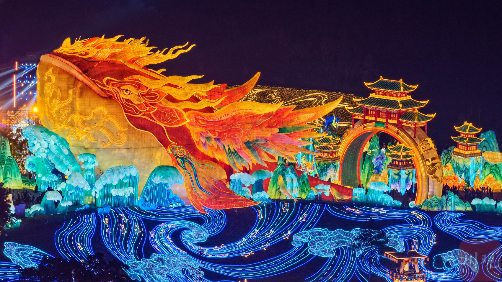 俯瞰灯海,10大主题板块精巧布局,11组巨型彩灯与200余组中小型彩灯层次分明,尽收眼底。镜头穿梭间,180米长的“木兰传奇”灯组如连环画般舒展;35米高的“华结映门”正反皆美,宛若时空之门;而长210米、高32米的“神奇华夏”鲲鹏灯组,更显气势磅礴。各式灯组流光溢彩,吸引着海内外游客纷至沓来,共赴这场璀璨的光影之约。