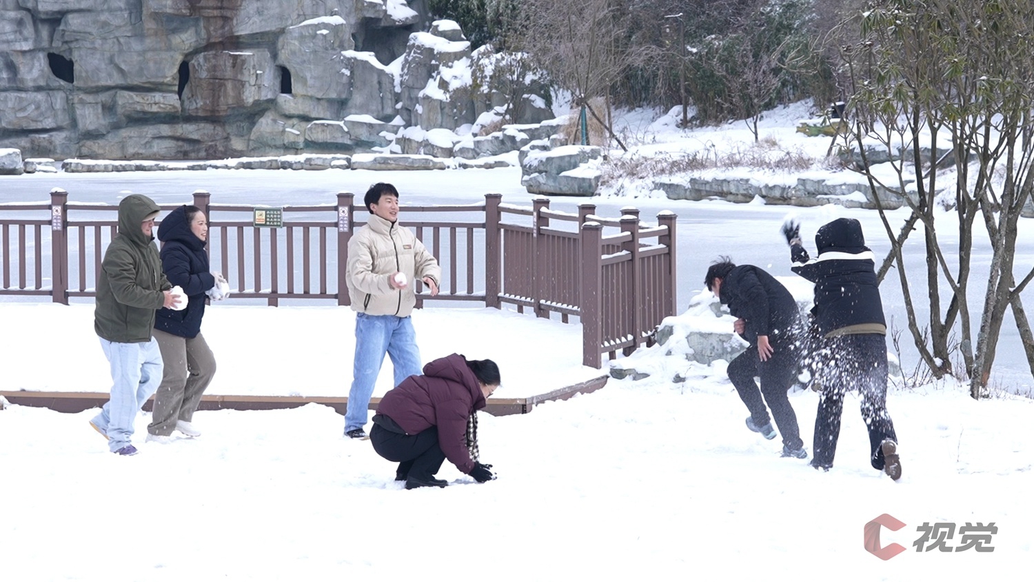 1月25日,前来鸳鸯池森林公园赏雪的游人在雪地上打雪仗。C视觉签约摄影师 邱海容 摄