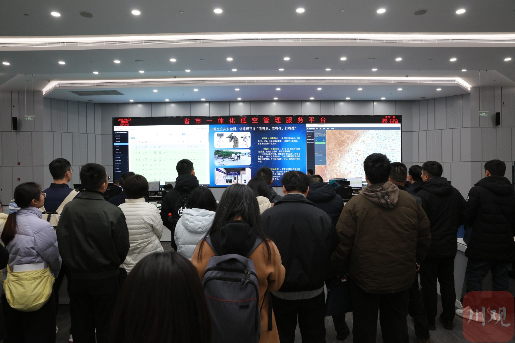学员走进省低空空域运行服务中心,了解已建成的集空域资源动态管理、飞行计划审批、安全监控于一体的运行服务平台。