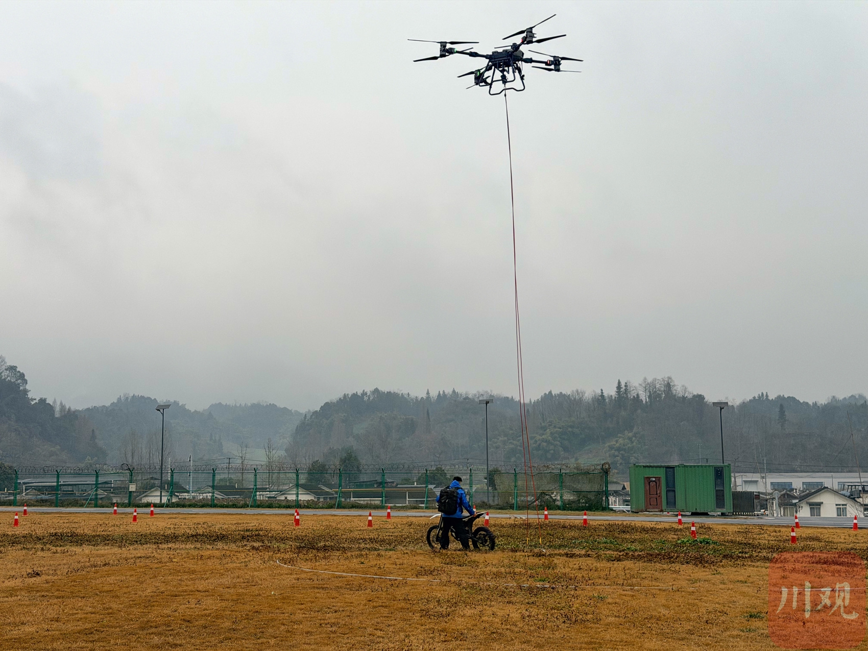 1月29日,在彭州“天空之眼”无人机试验基地,学员们在观看中测驰力航空科技(四川)有限公司现场演示KF-150重载无人机吊运摩托车。