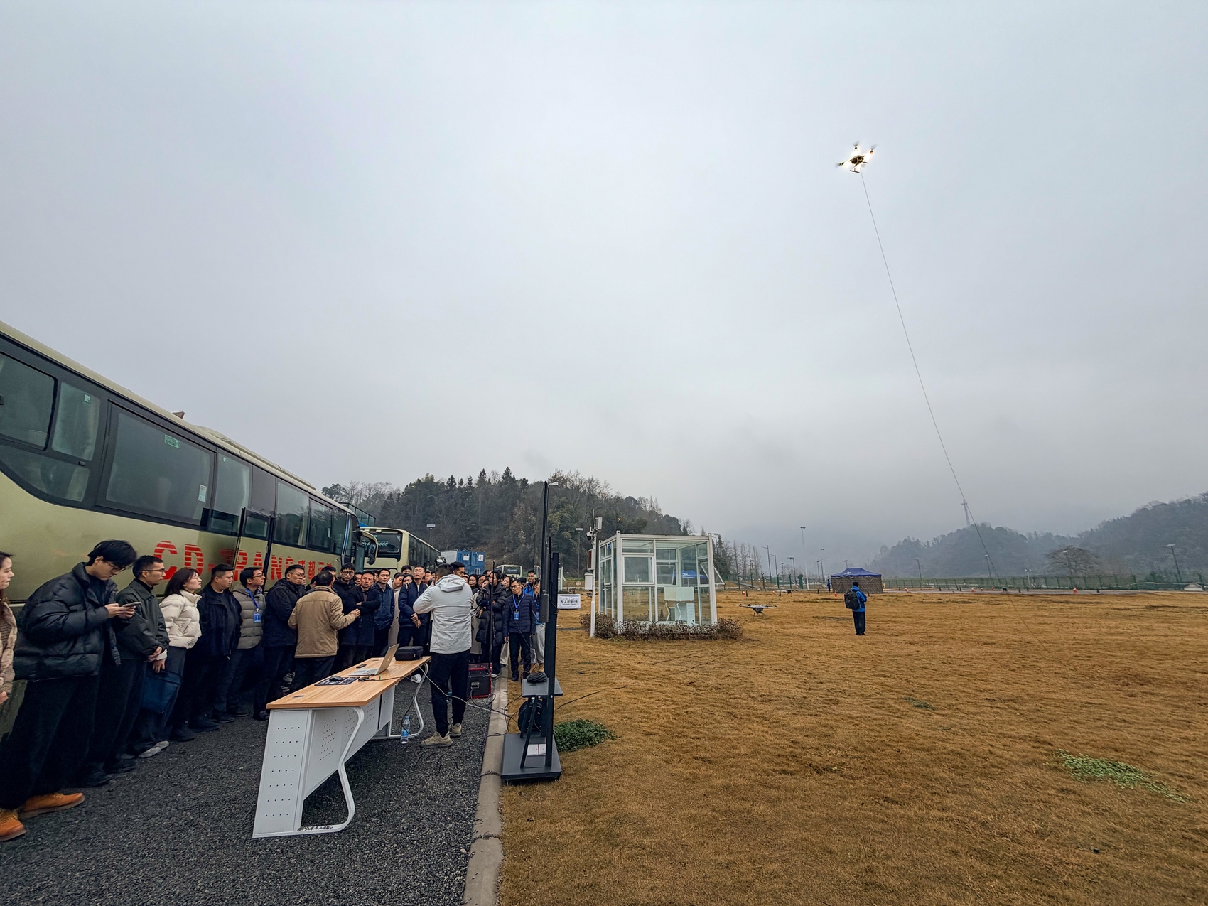1月29日,在彭州“天空之眼”无人机试验基地,学员们在观看四川伊娃云智科技有限公司现场演示曙之光ER-T700驻空照明机器人。