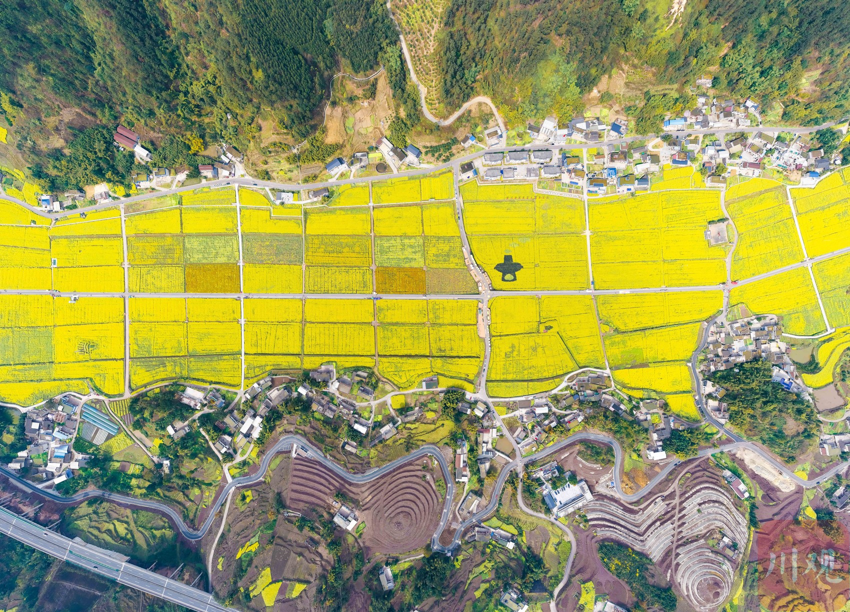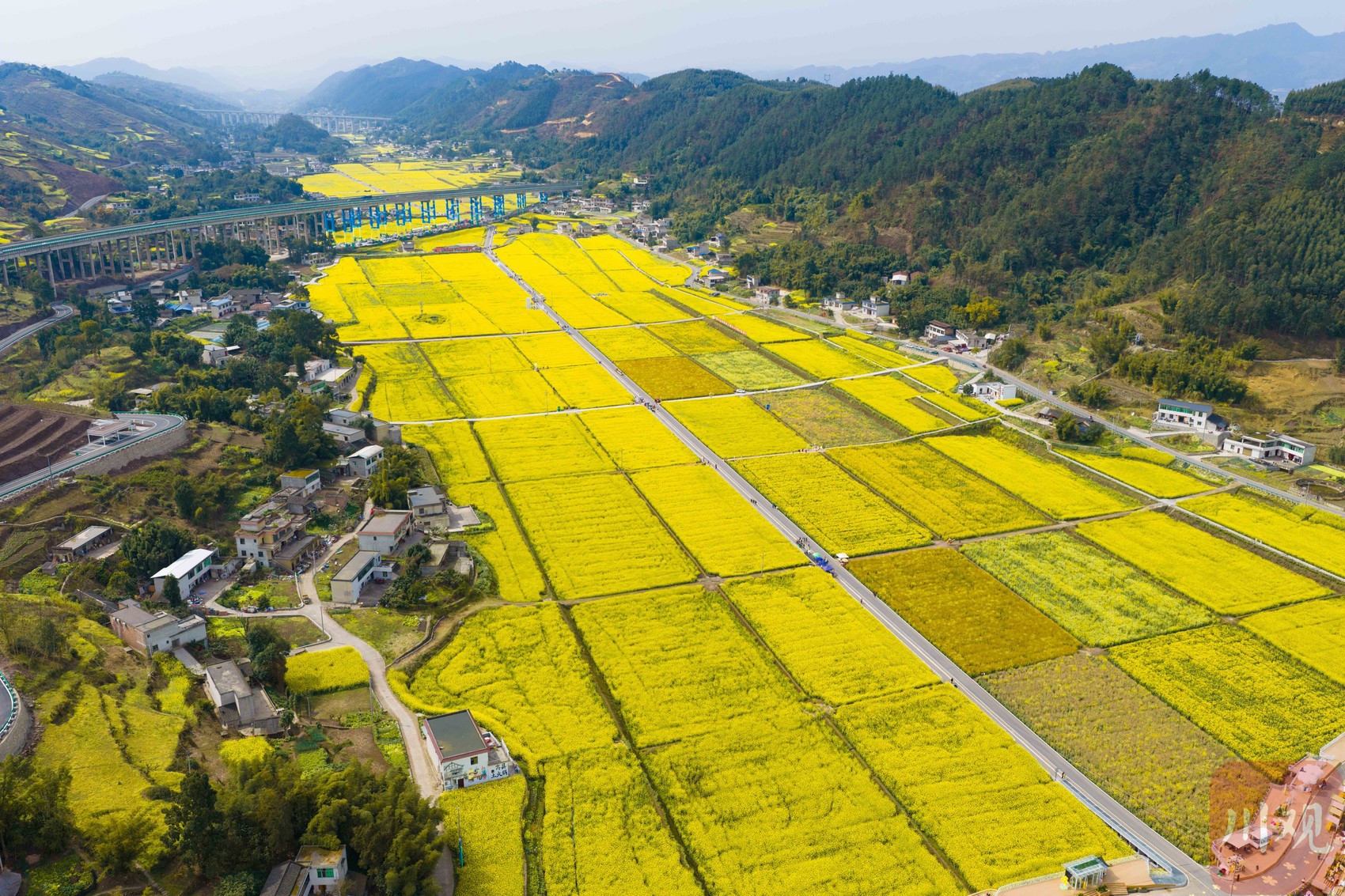 2月25日,记者走进园区,通过无人机从空中俯瞰,只见金黄色的花朵铺满田野,宛如给大地铺上了一层春日最炫“地毯”。盛开的油菜花与青瓦白墙的民居相互映衬,错落有致,色彩斑斓,构成了一幅美不胜收的田园风光图。微风拂过,花浪翻滚,花香四溢,令人心旷神怡。